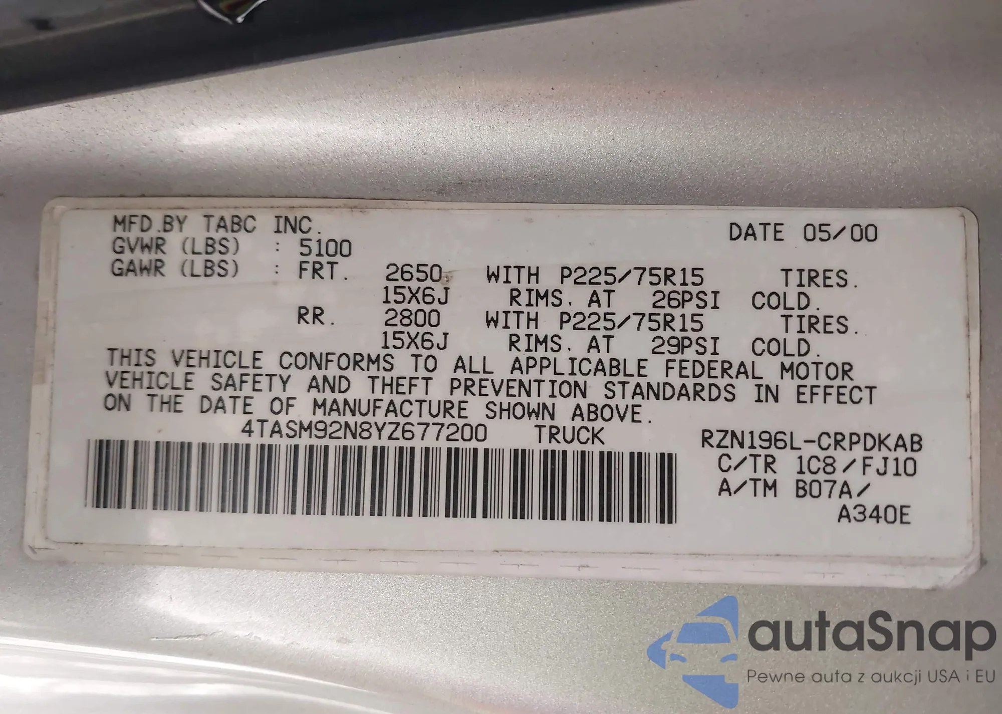 • VIN 4TASM92N8YZ677200