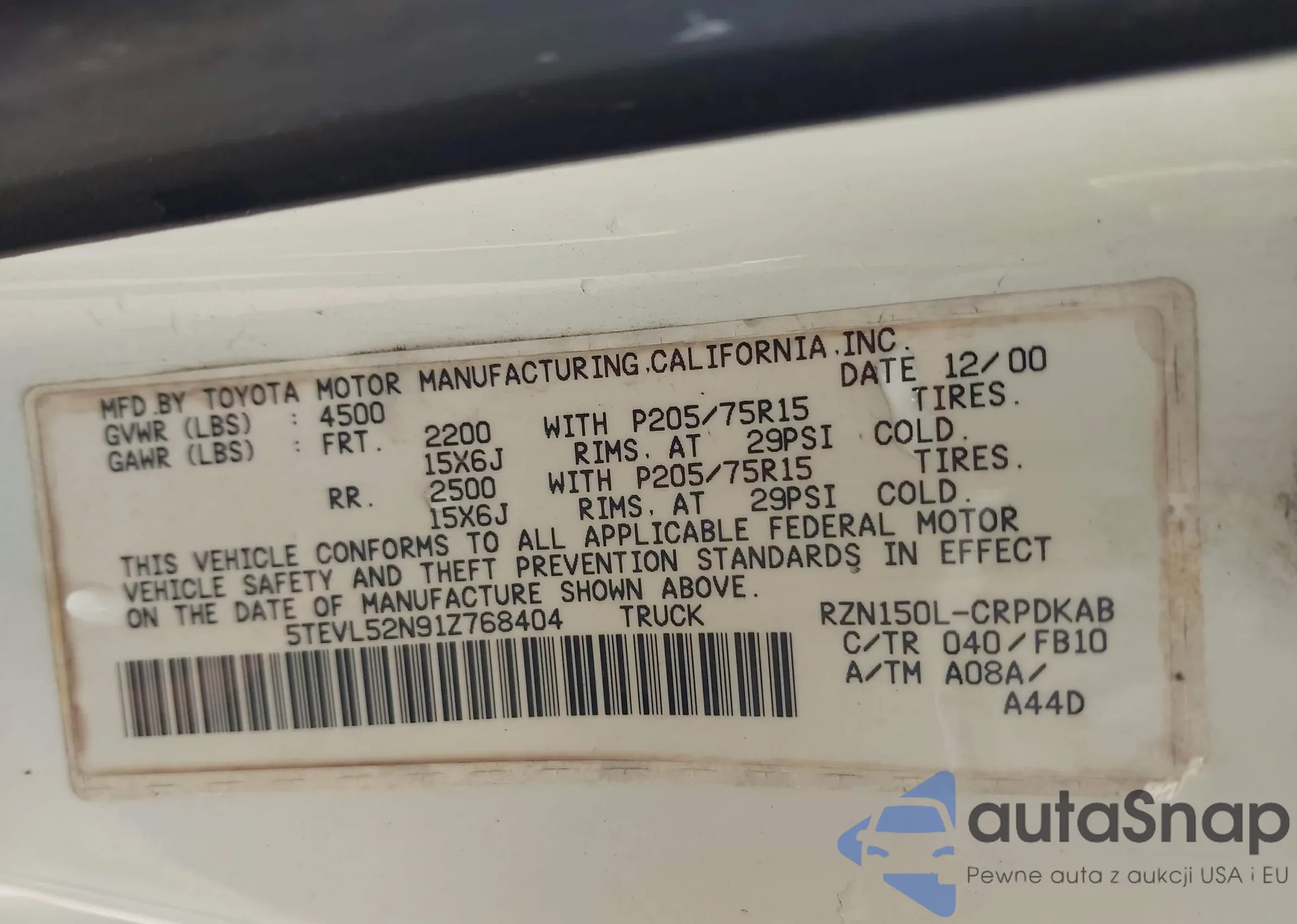 LOT: 44695335 VIN: 5TEVL52N91Z768404