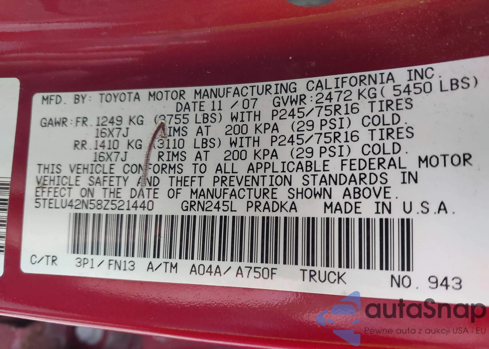 • VIN 5TFJU4GN2BX001968
