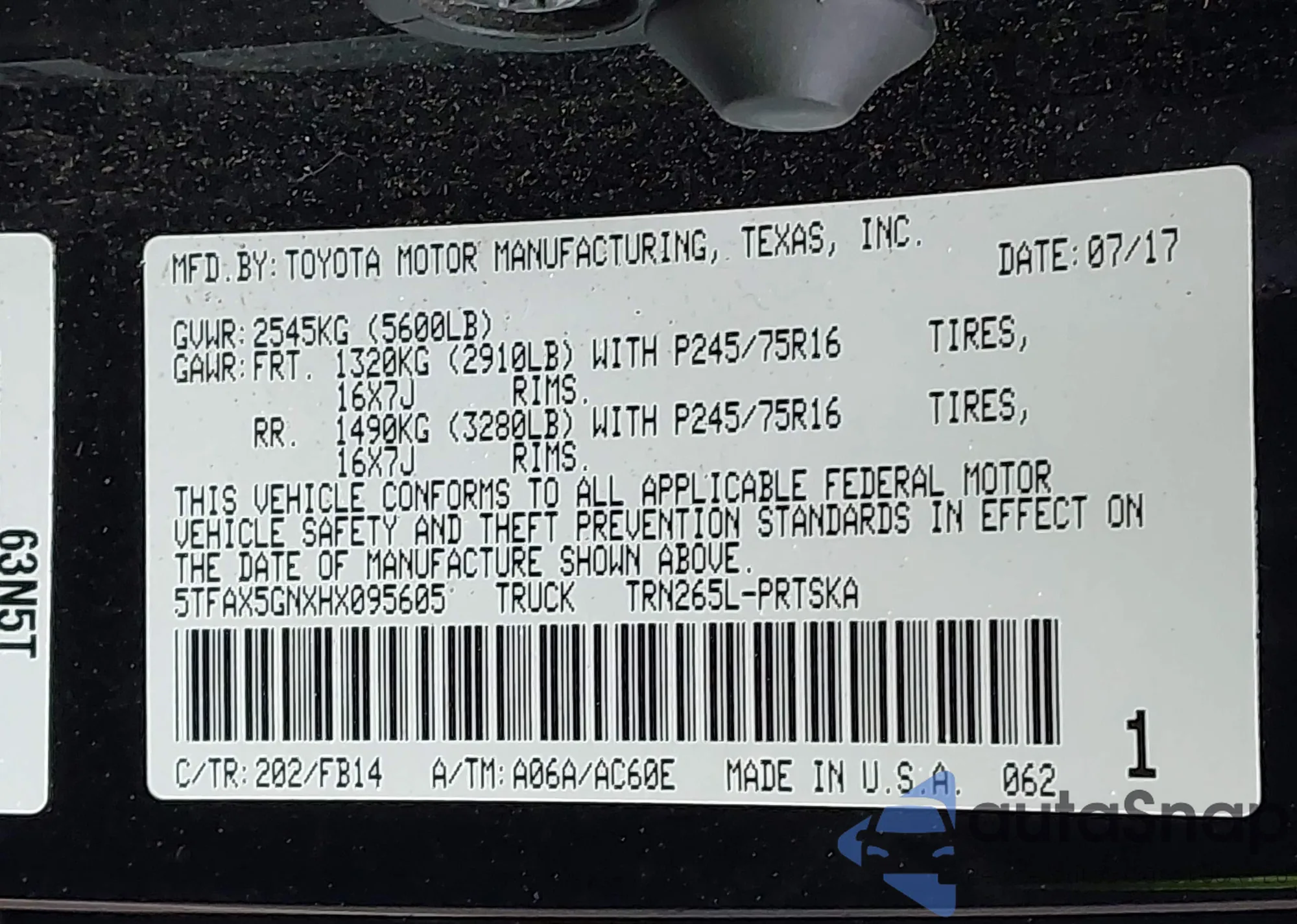 • VIN 5TFCZ5AN7LX232097