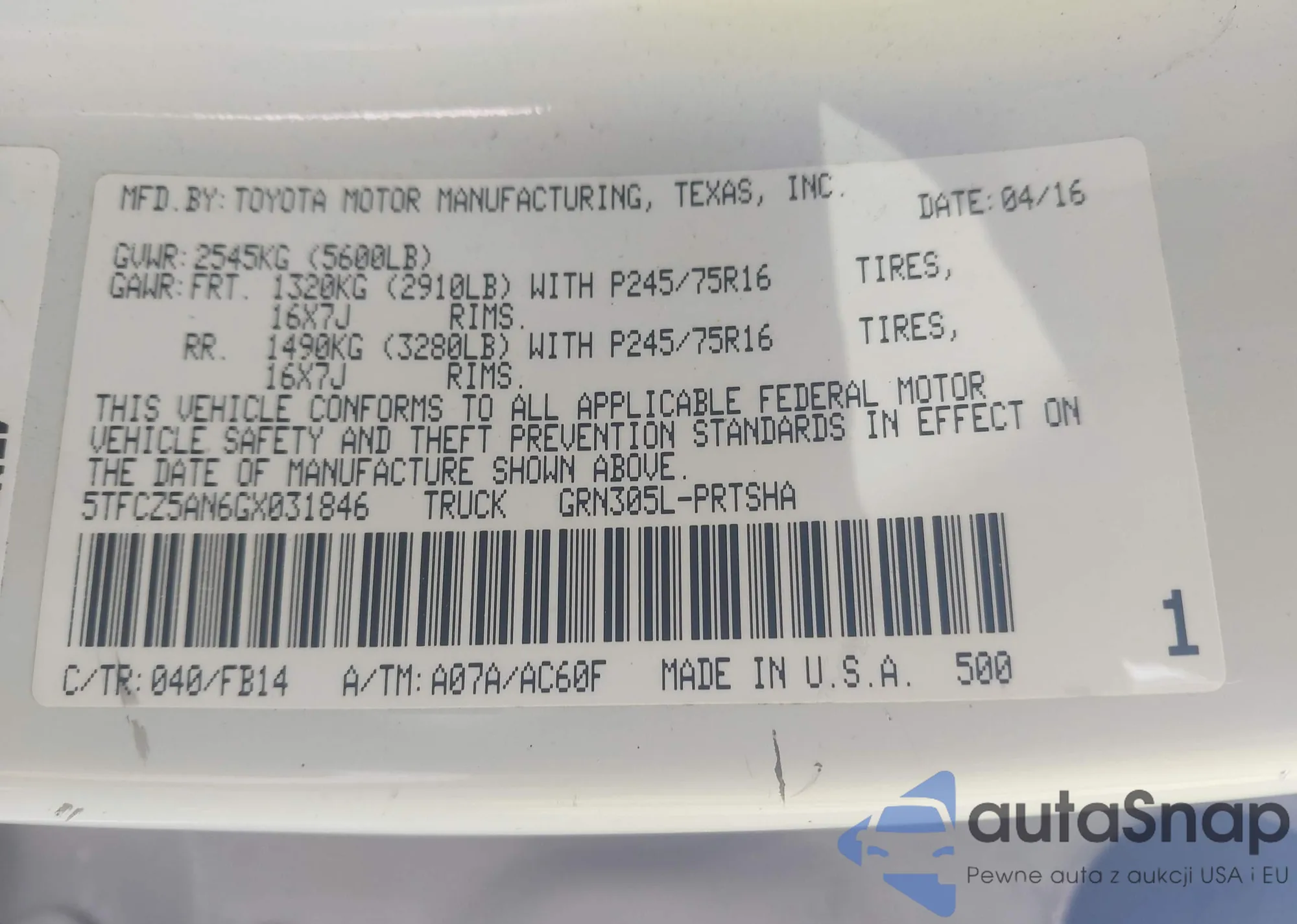 • VIN 5TFCZ5AN6GX031846