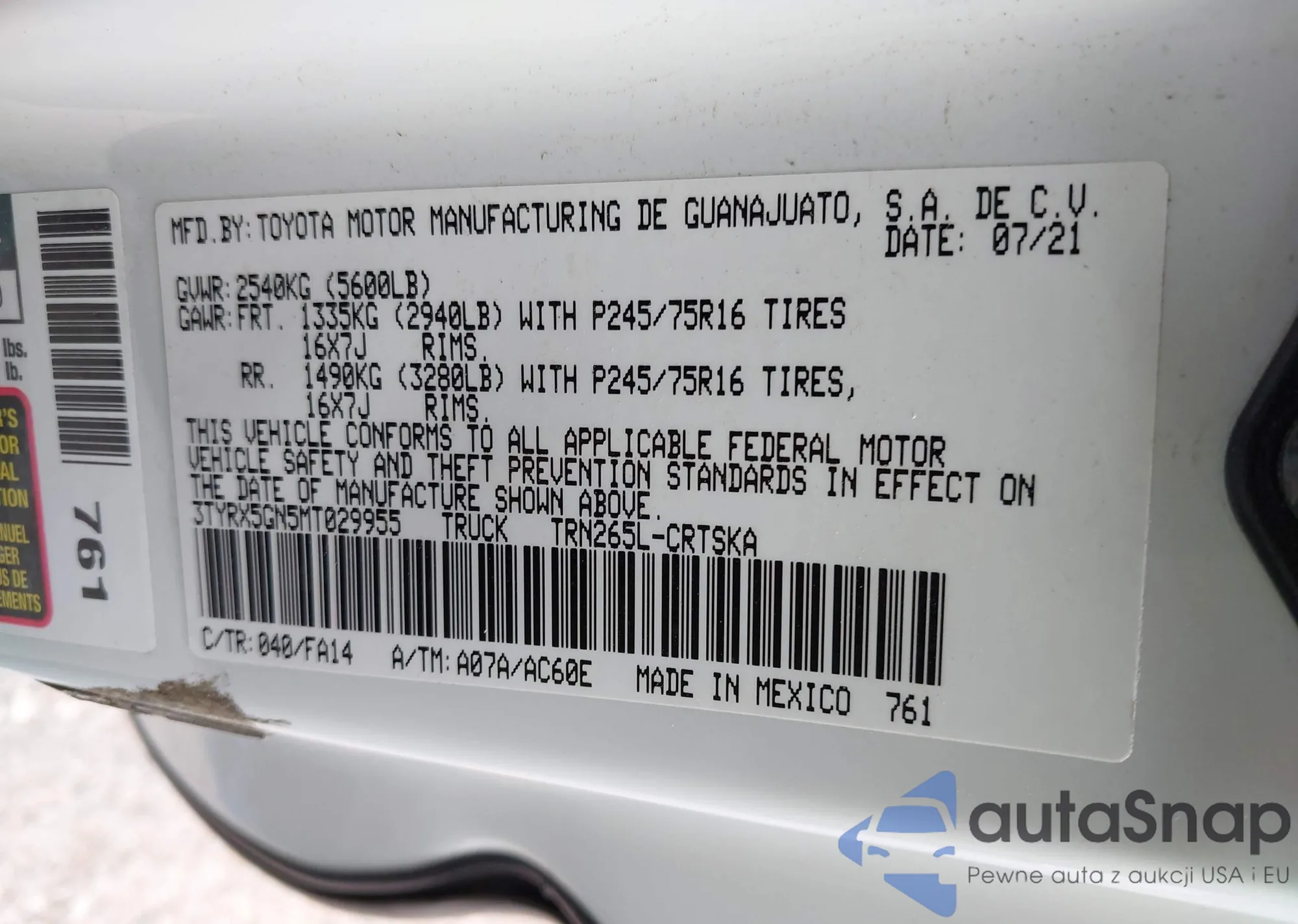 LOT: 42914864 VIN: 3TYRX5GN5MT029955