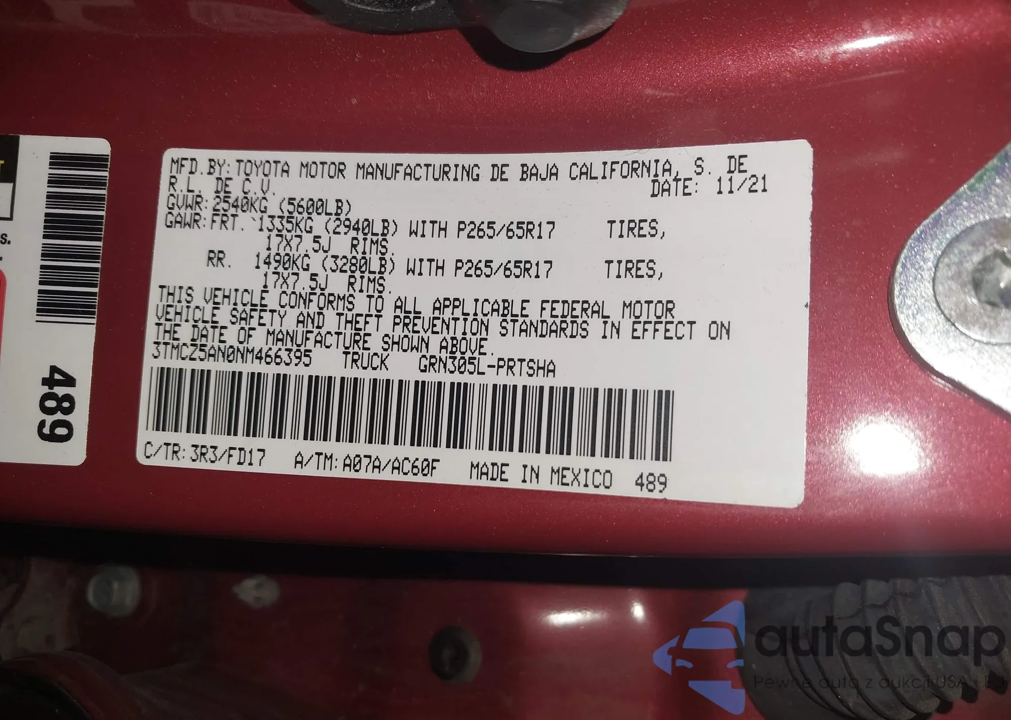 • VIN 3TYAX5GN7MT022552