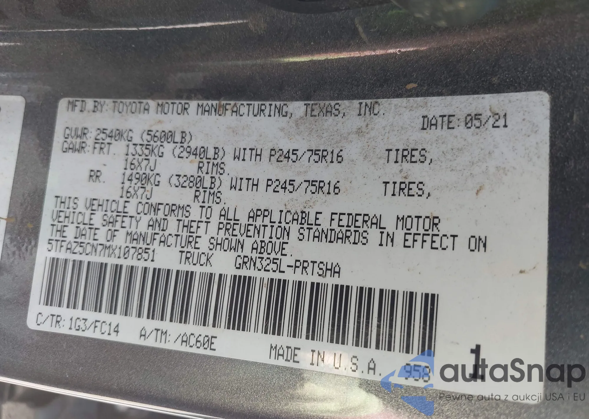 LOT: 43040268 VIN: 5TFAZ5CN7MX107851