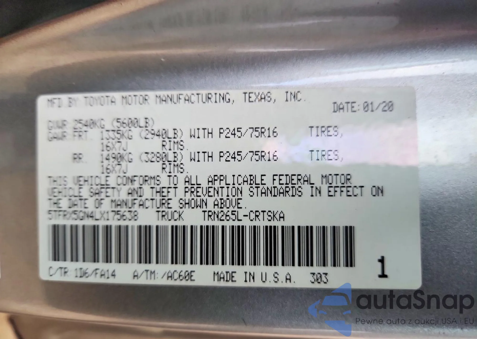 • VIN 5TFRX5GN4LX175638
