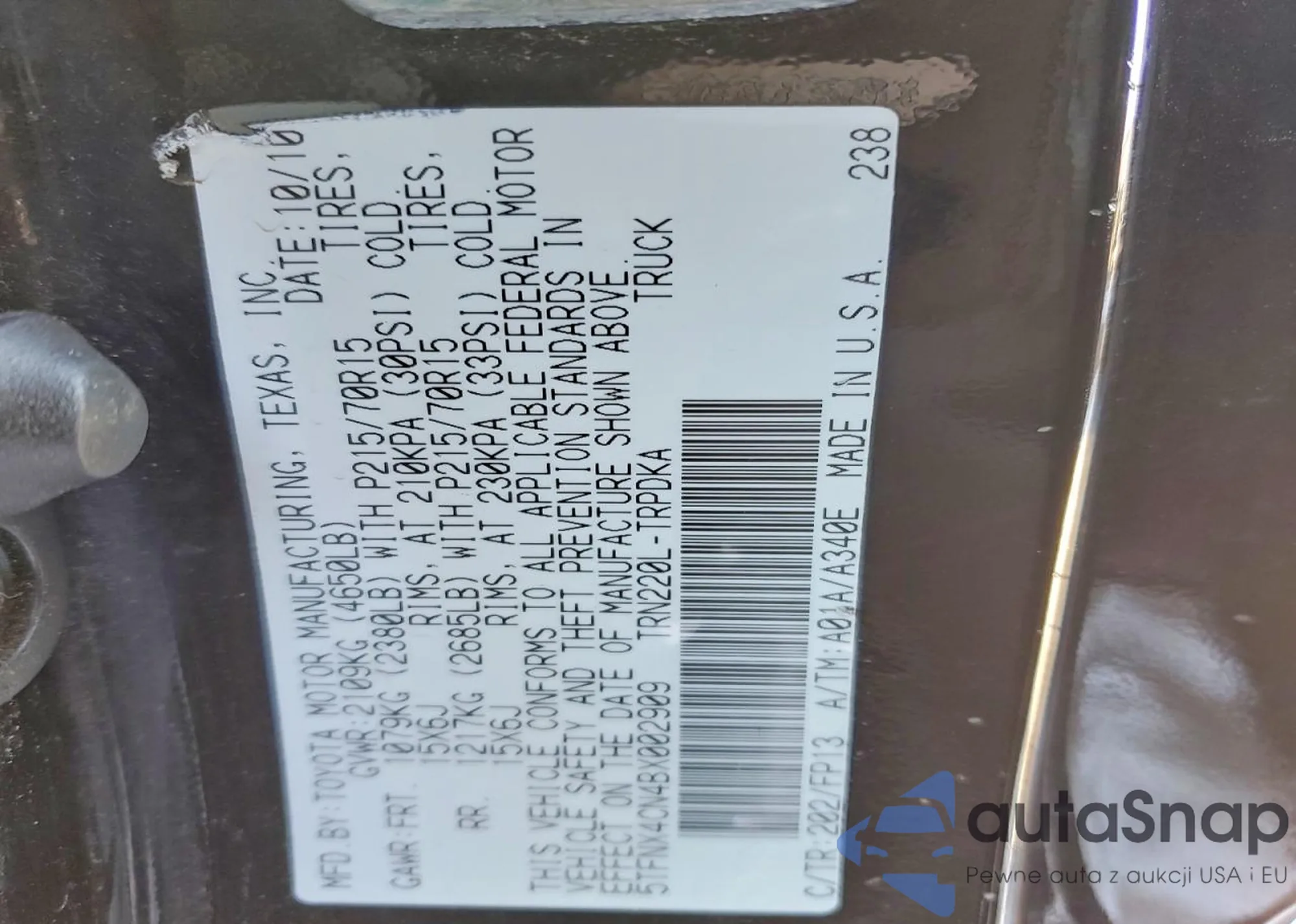 • VIN 5TFNX4CN4BX002909