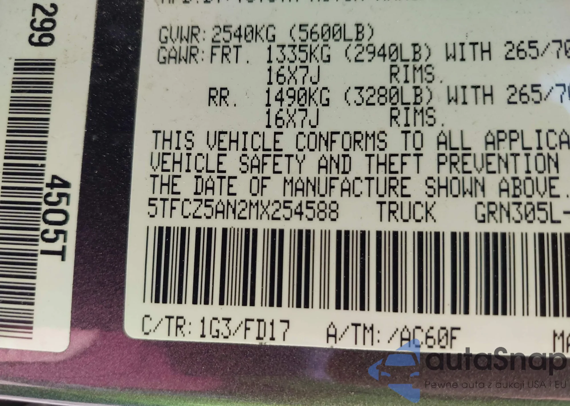 • VIN 5TFCZ5AN2MX254588