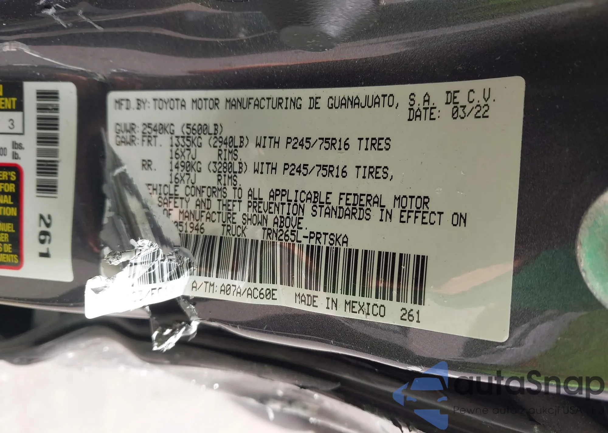 LOT: 44380542 VIN: 3TYAX5GN6NT051946