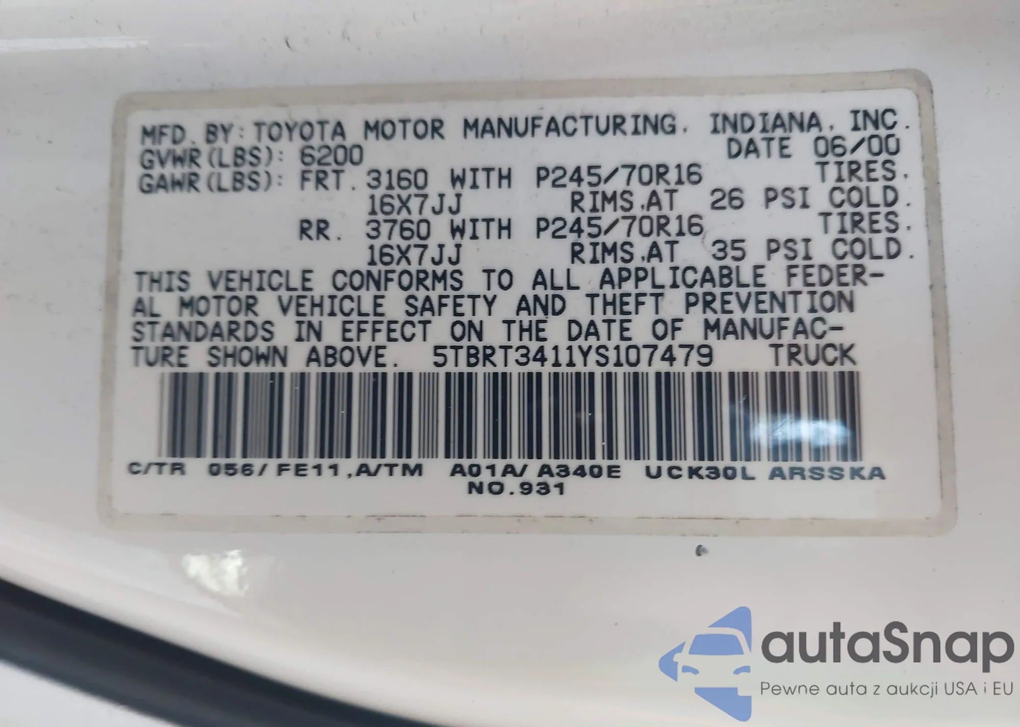 • VIN 5TBRT3411YS107479