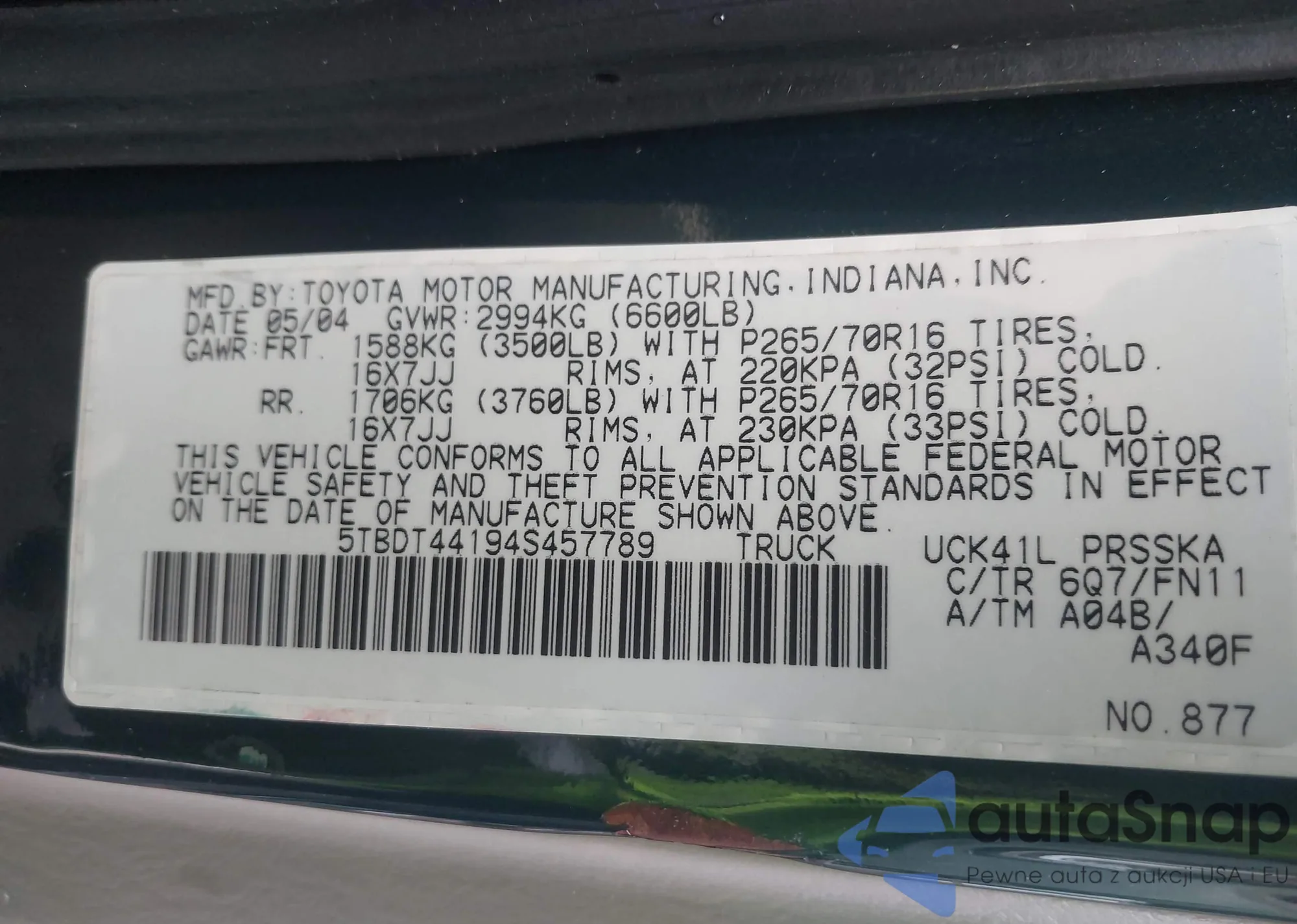 LOT: 44361456 VIN: 5TBDT44194S457789