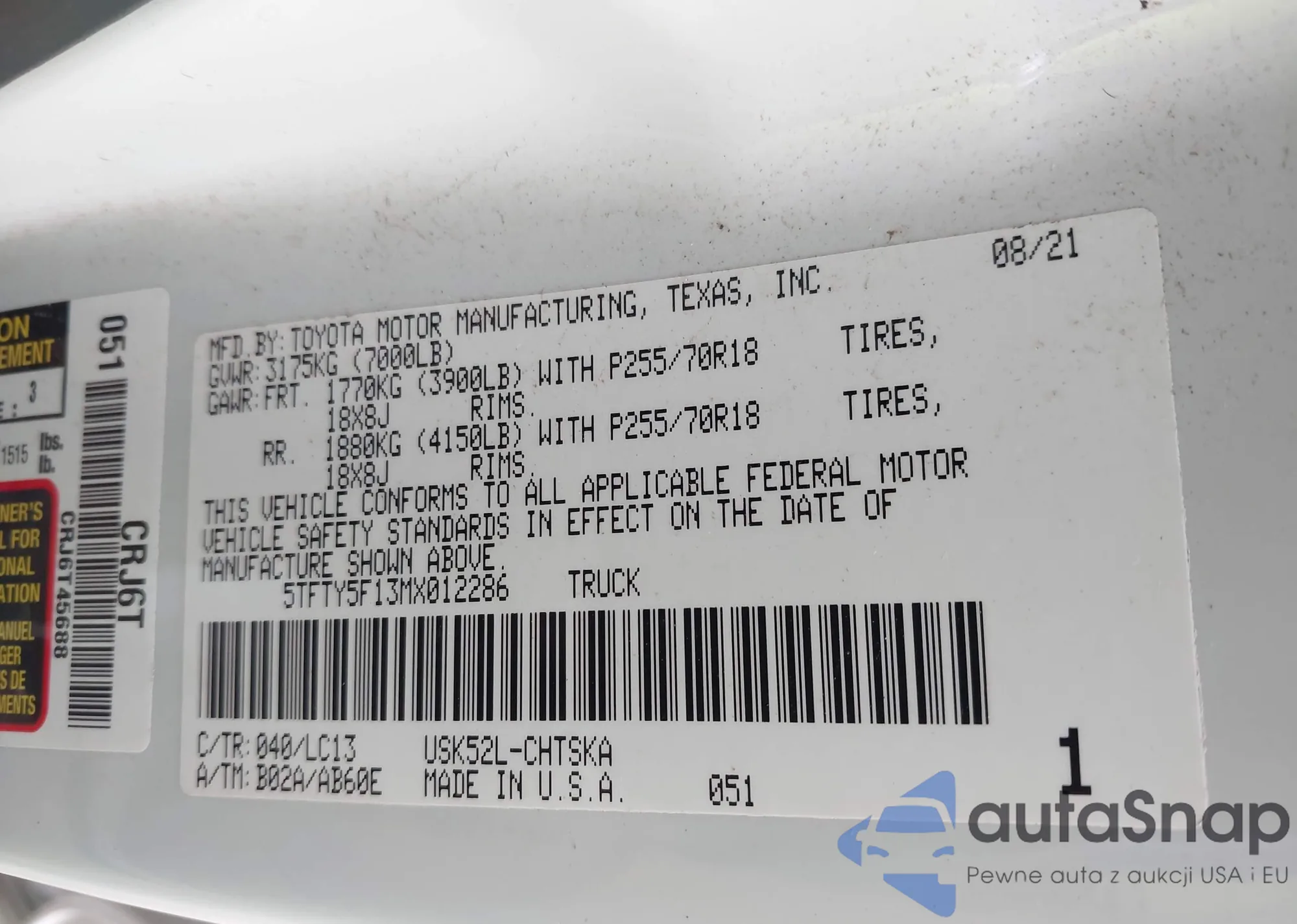 LOT: 43782581 VIN: 5TFTY5F13MX012286