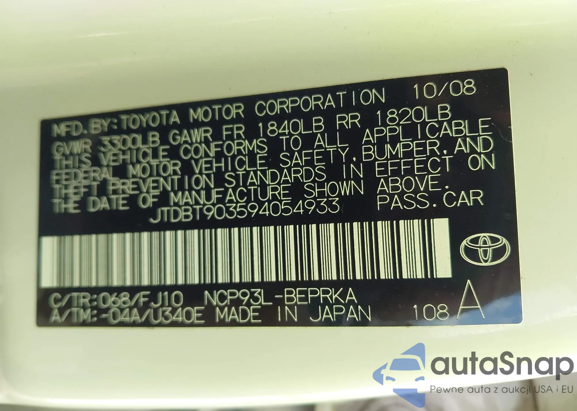 LOT: 44552938 VIN: JTDBT903594054933