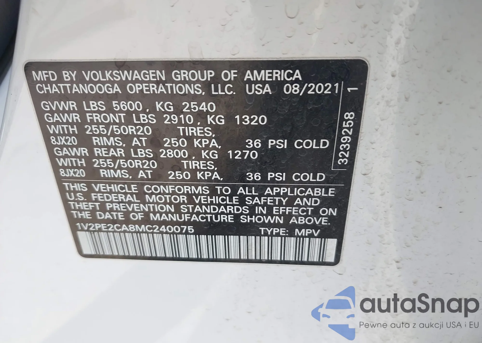 LOT: 44028116 VIN: 1V2PE2CA8MC240075