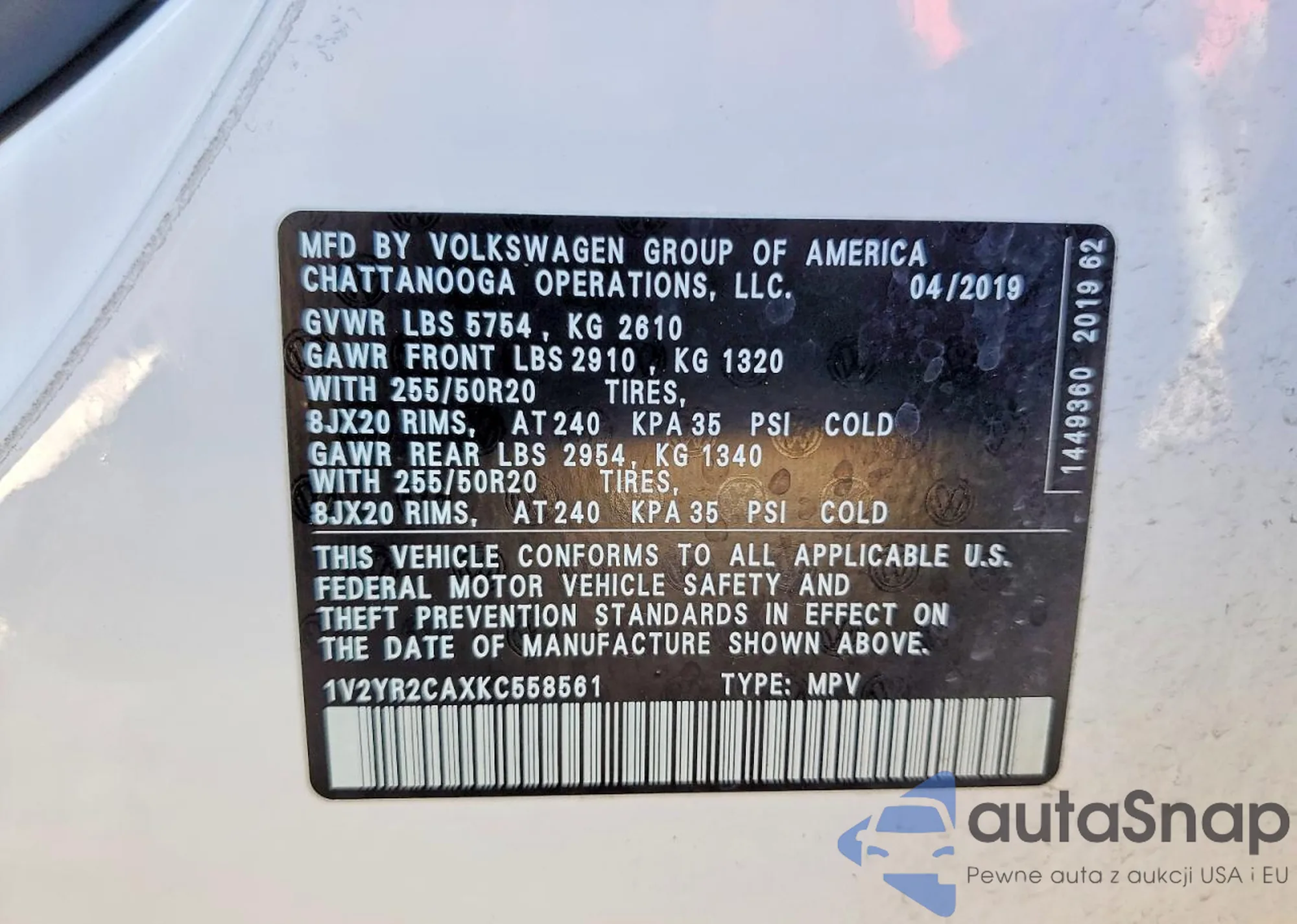 • VIN 1V2YR2CAXKC558561