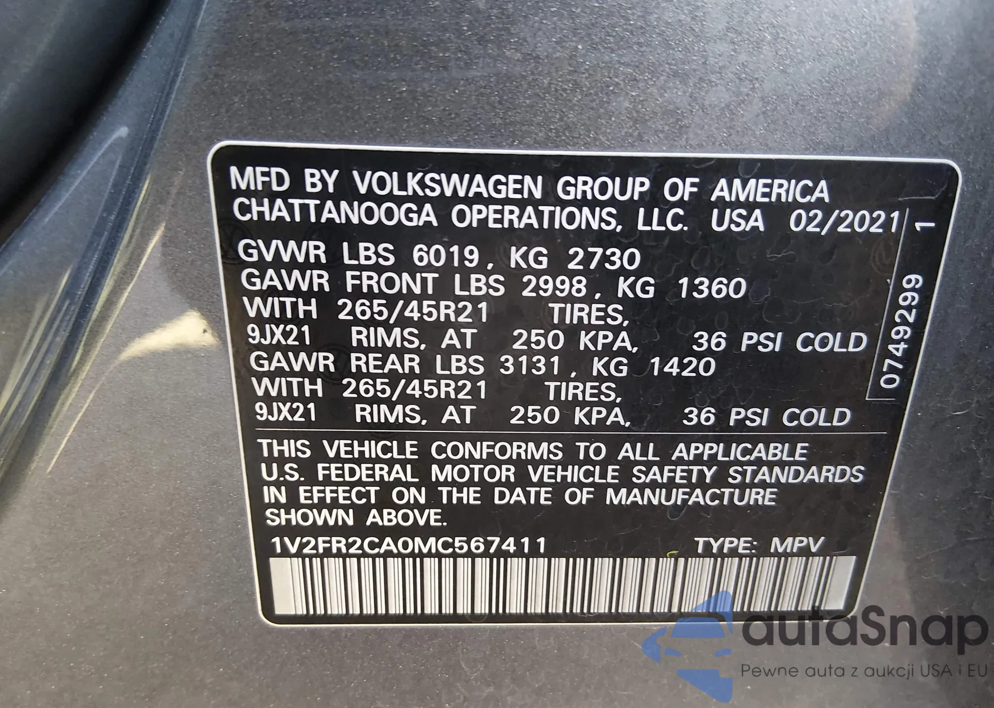 • VIN 1V2FR2CA0MC567411