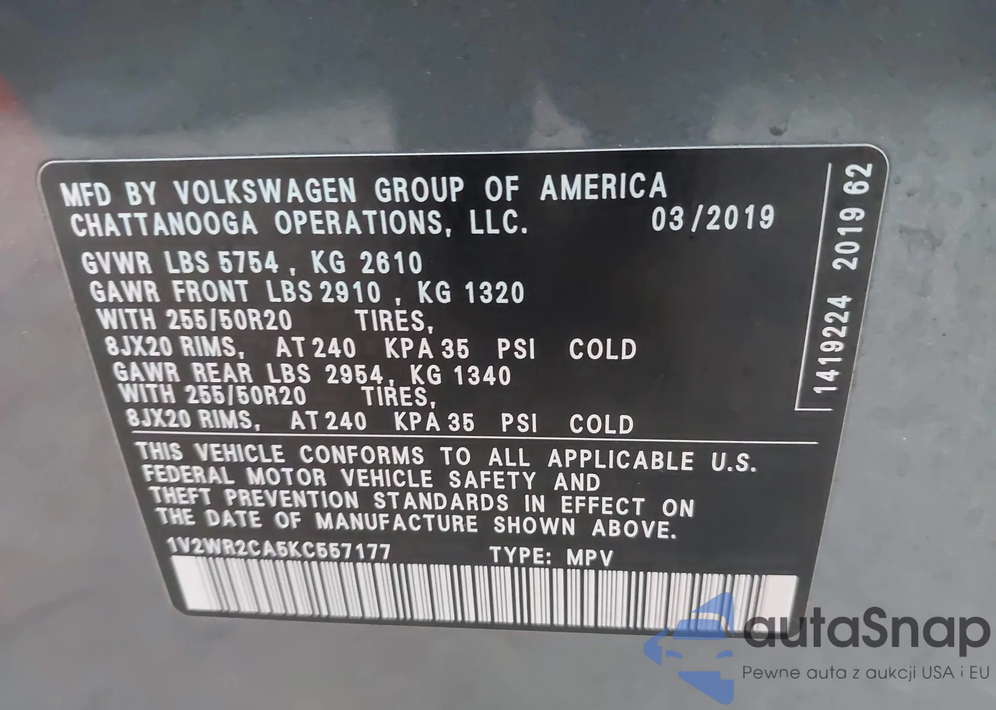 LOT: 44008288 VIN: 1V2WR2CA5KC557177