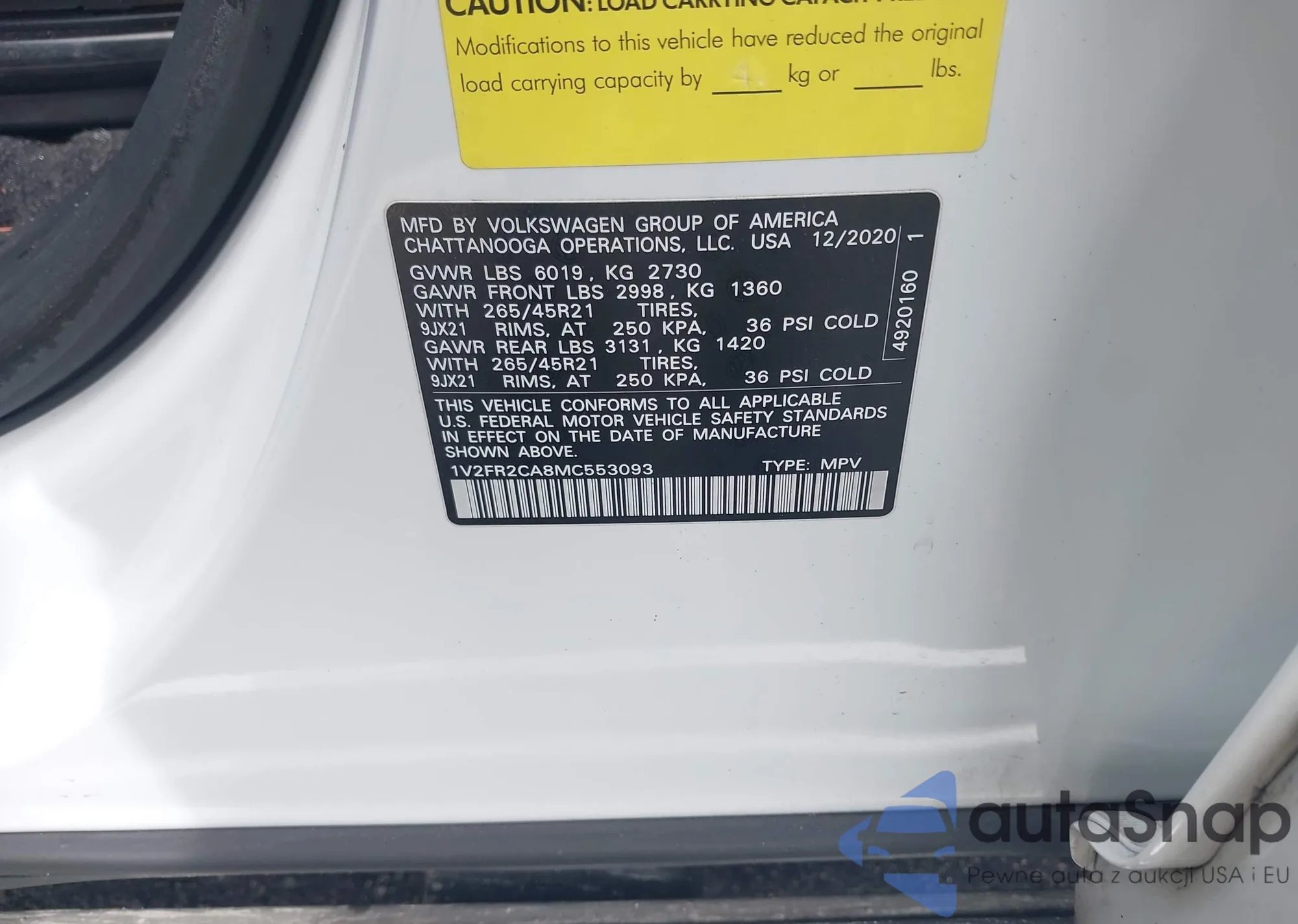 LOT: 44138927 VIN: 1V2FR2CA8MC553093