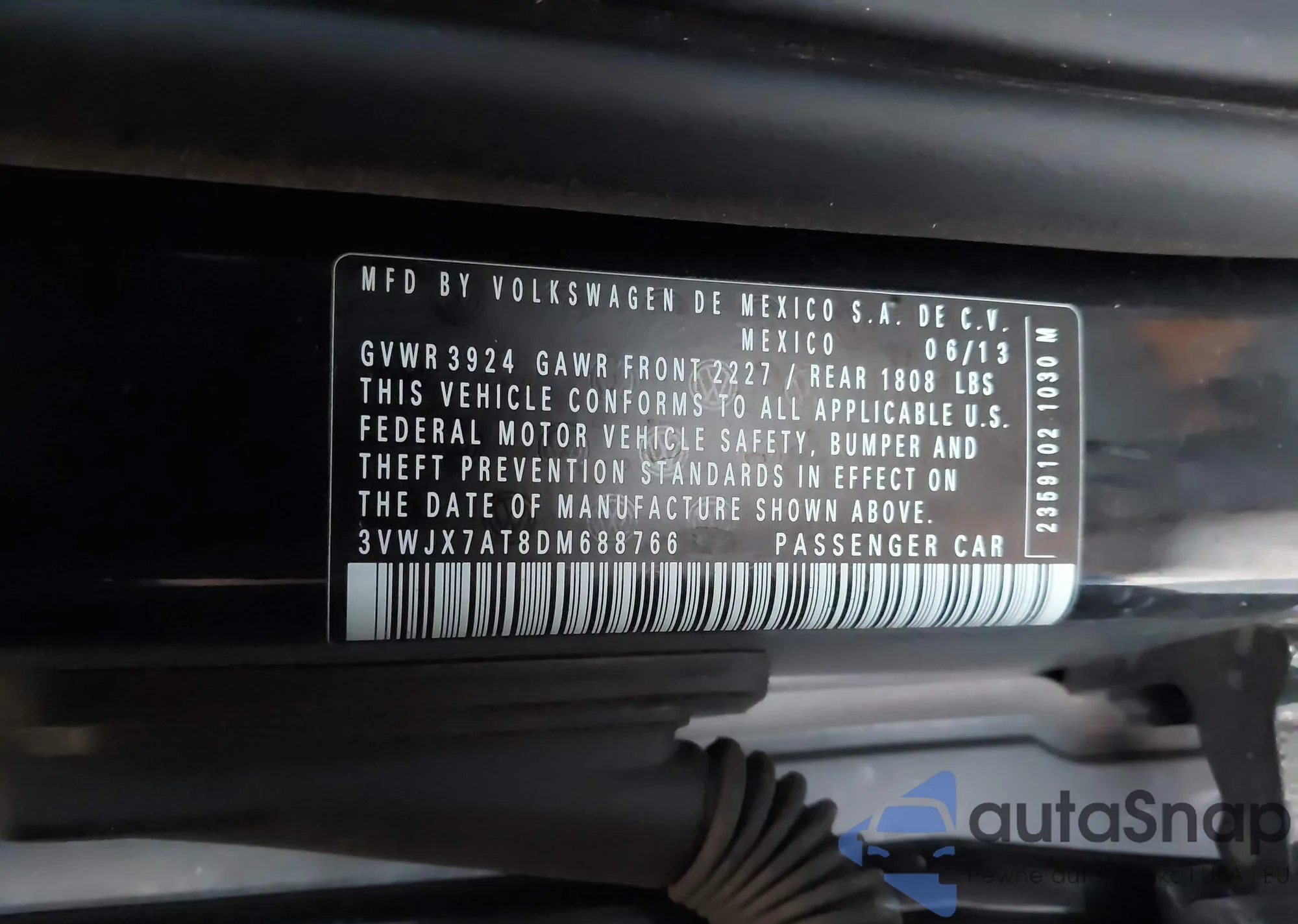 • VIN 3VWJX7AT8DM688766