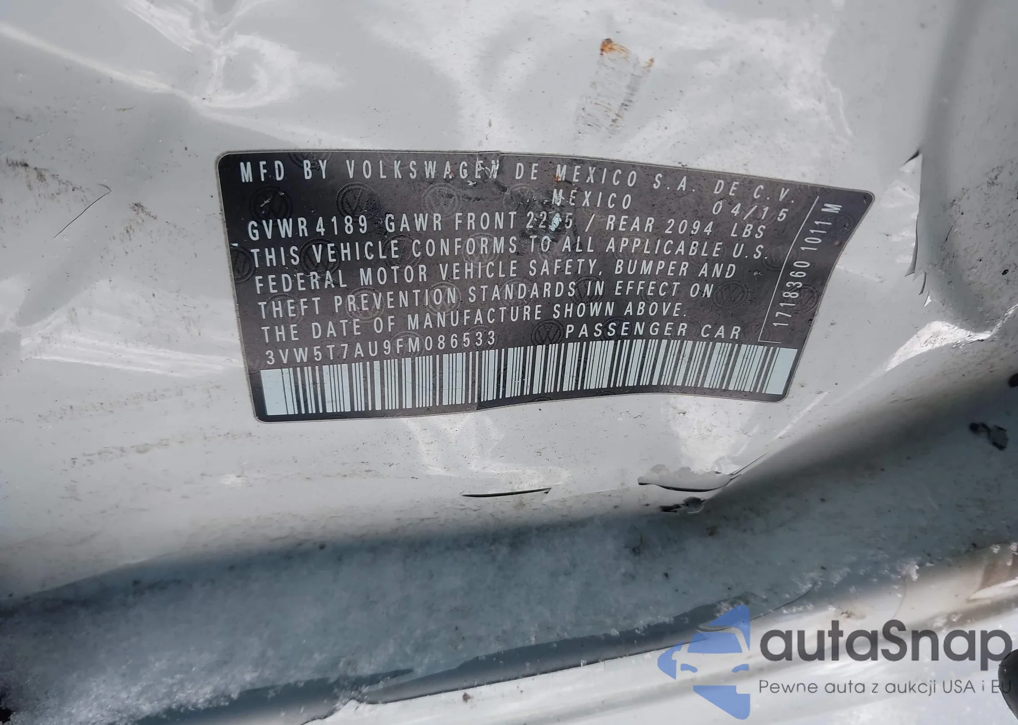 • VIN 3VW5T7AU9FM086533