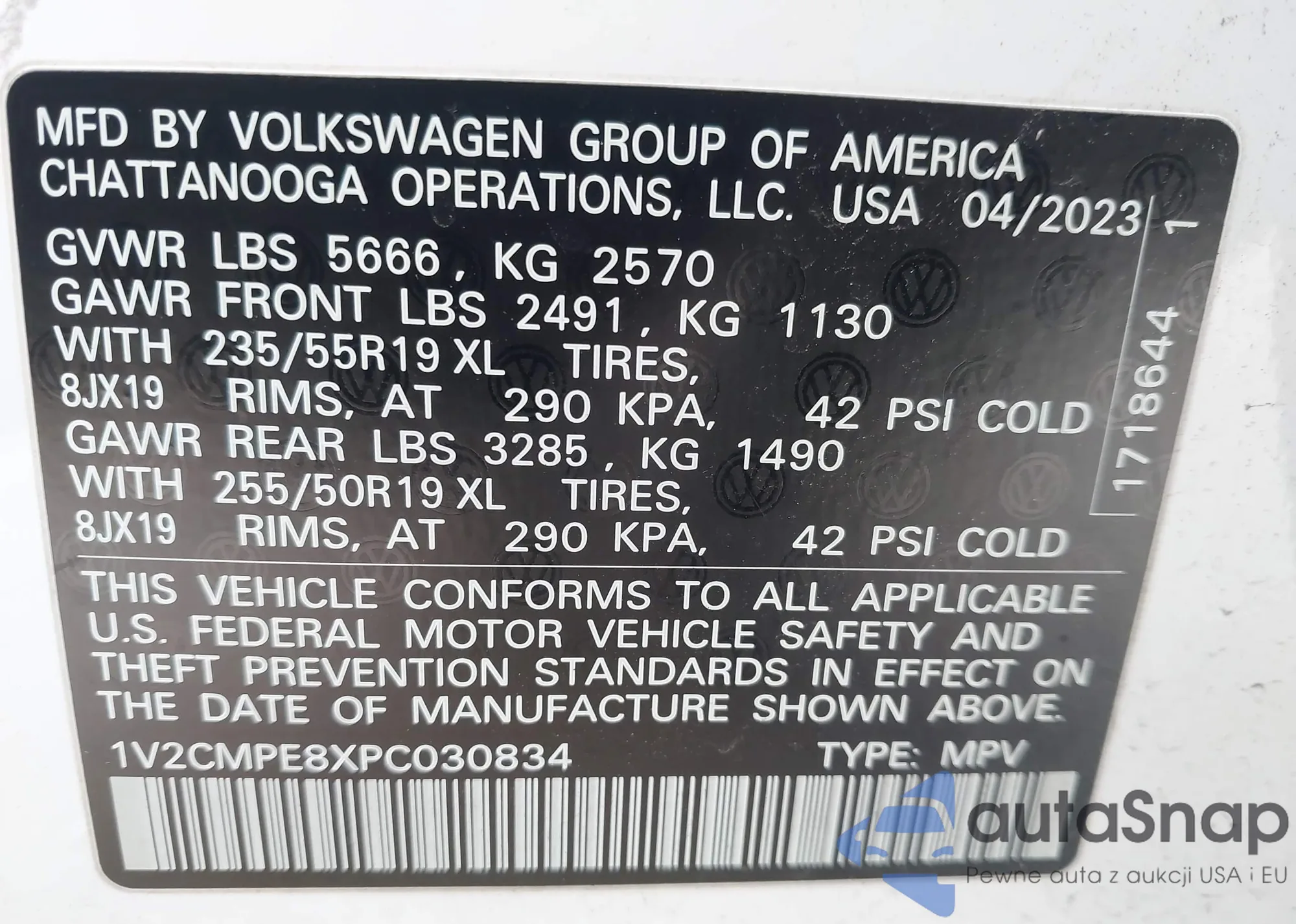 LOT: 43857318 VIN: 1V2CMPE8XPC030834