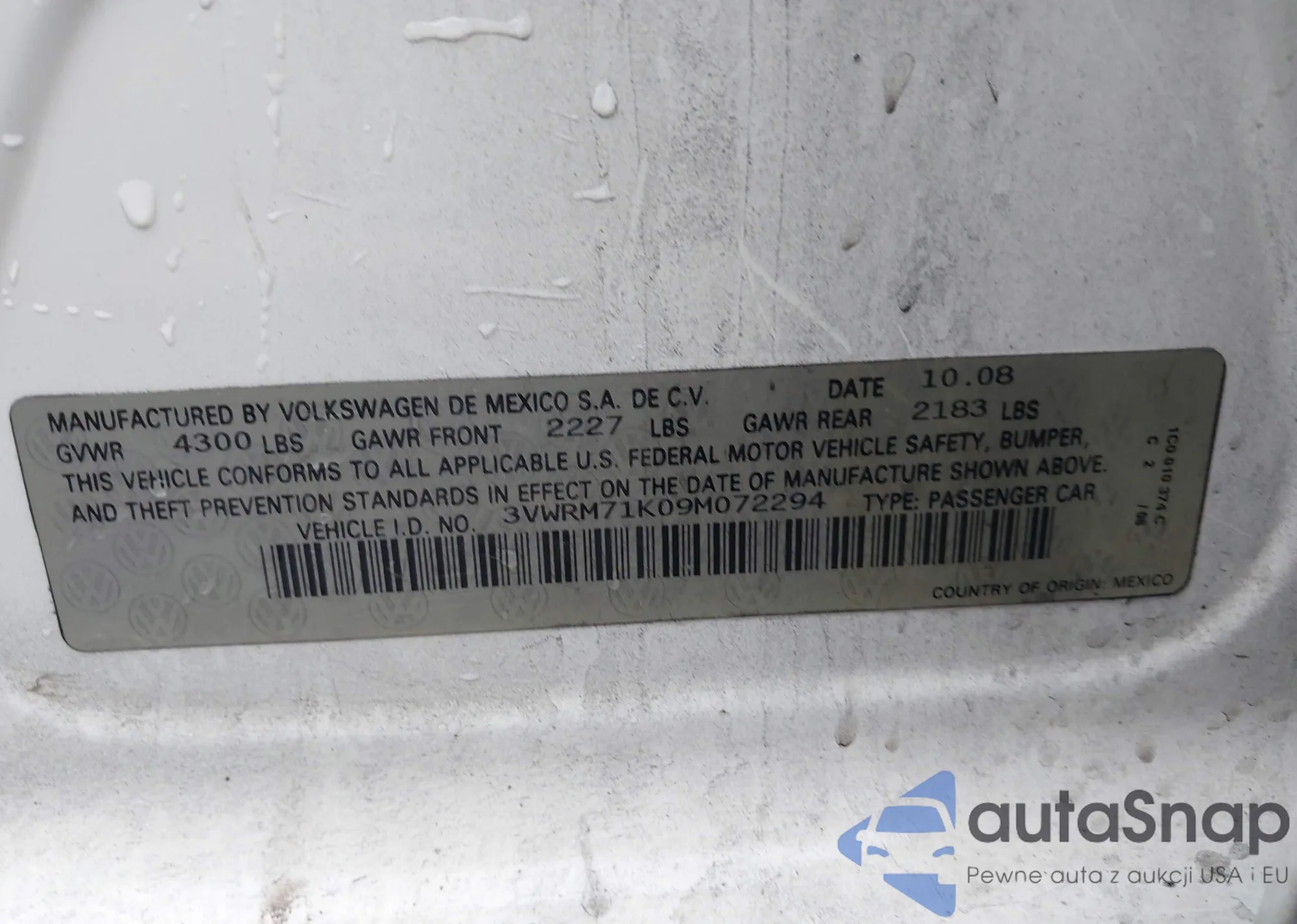 LOT: 44036160 VIN: 3VWRM71K89M172692
