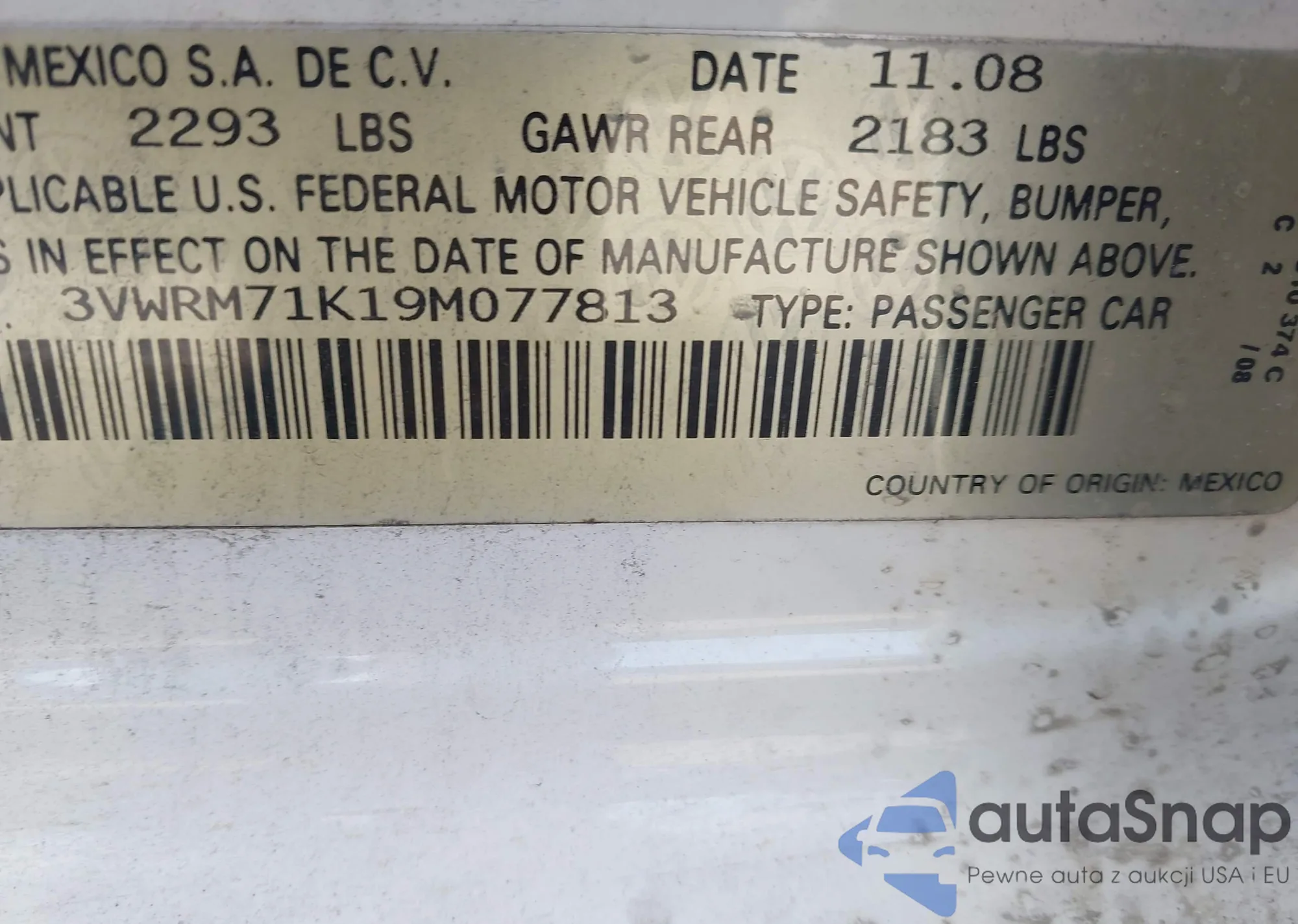 • VIN 3VWRM71K19M077813