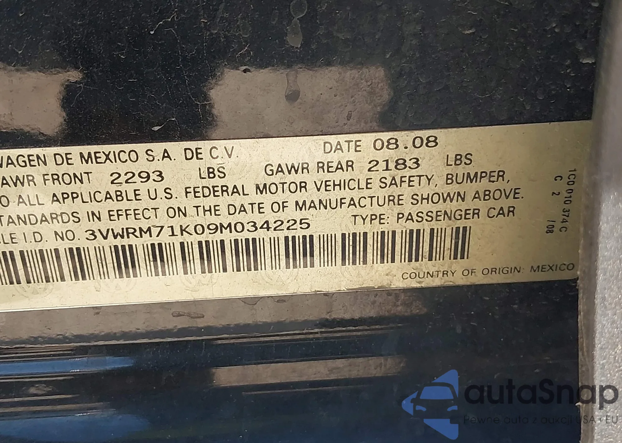 LOT: 42340874 VIN: 3VWRM71K89M172076