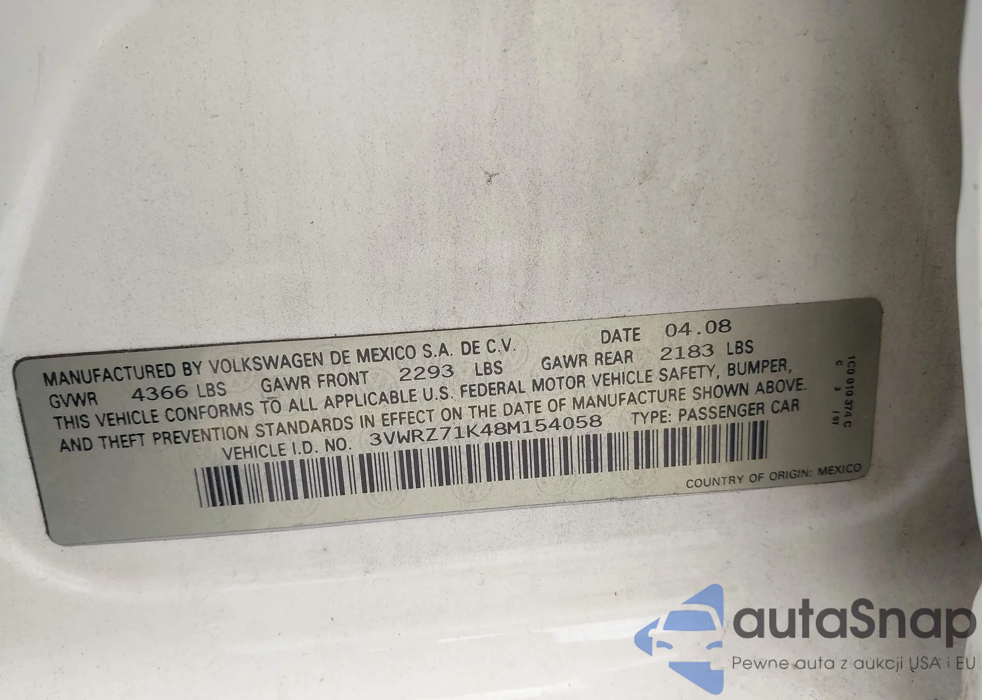 • VIN 3VWRZ71K48M154058