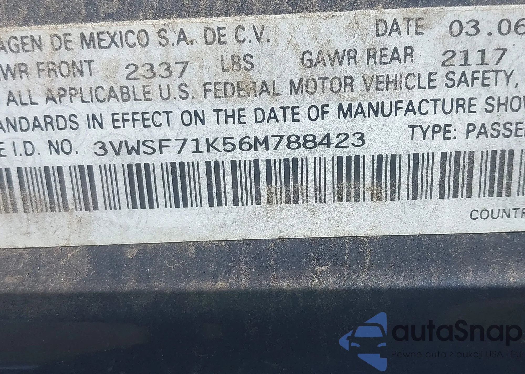 LOT: 42625936 VIN: 3VWSF71K56M788423