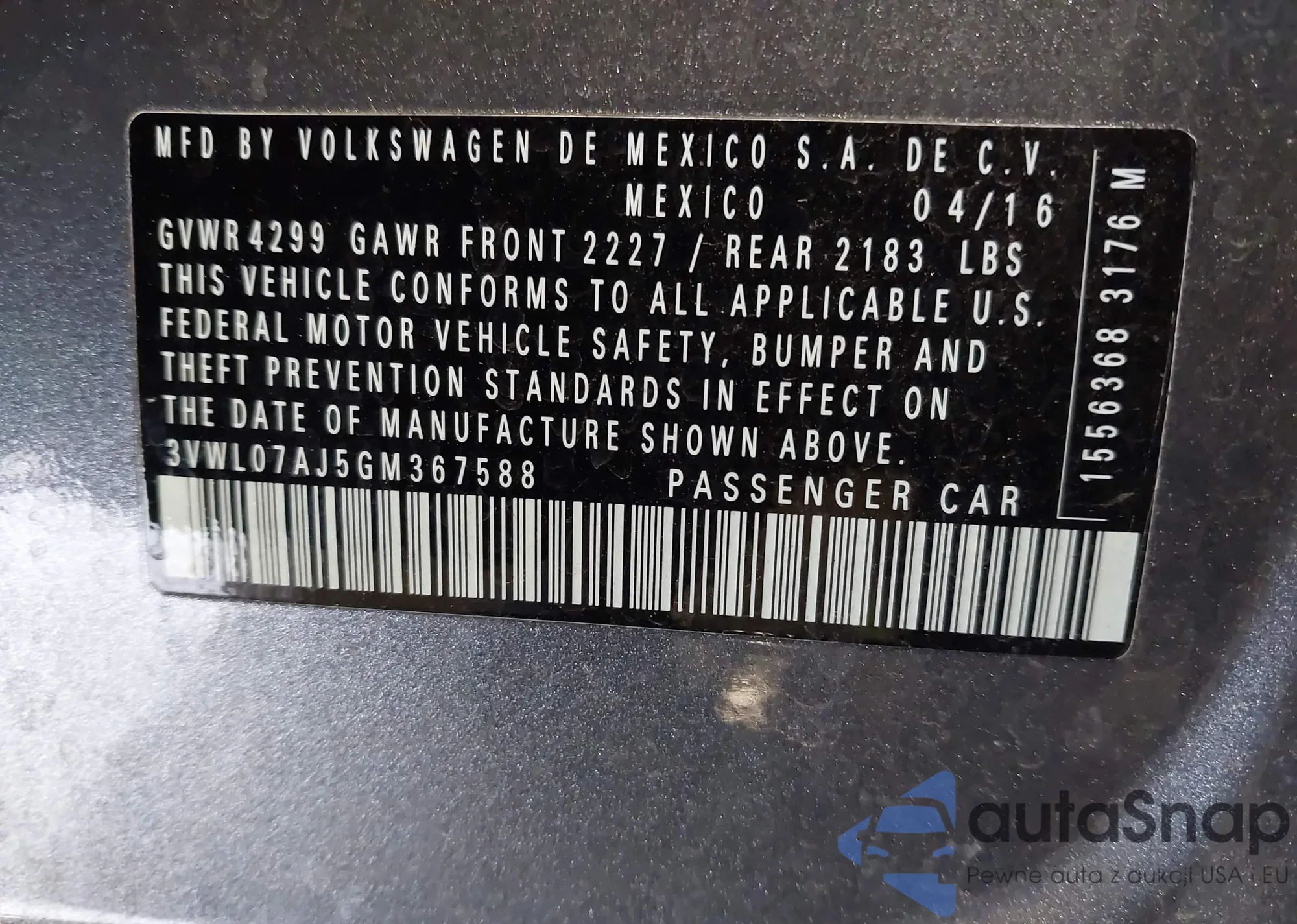 • VIN 3VWL07AJ5GM367588