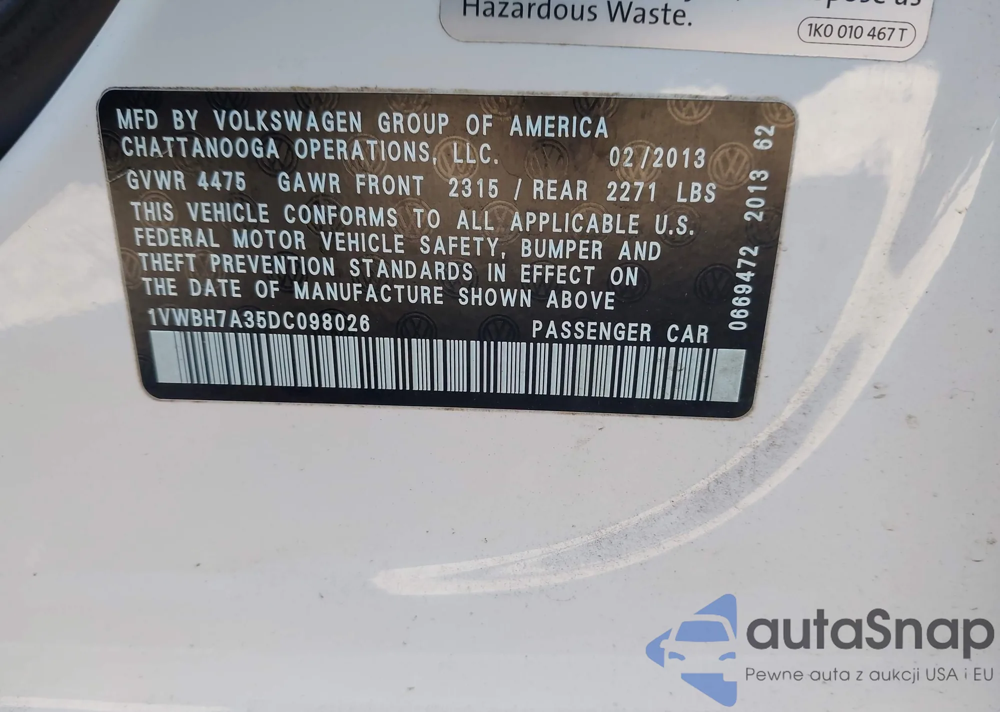 • VIN 1VWBP7A31DC045018