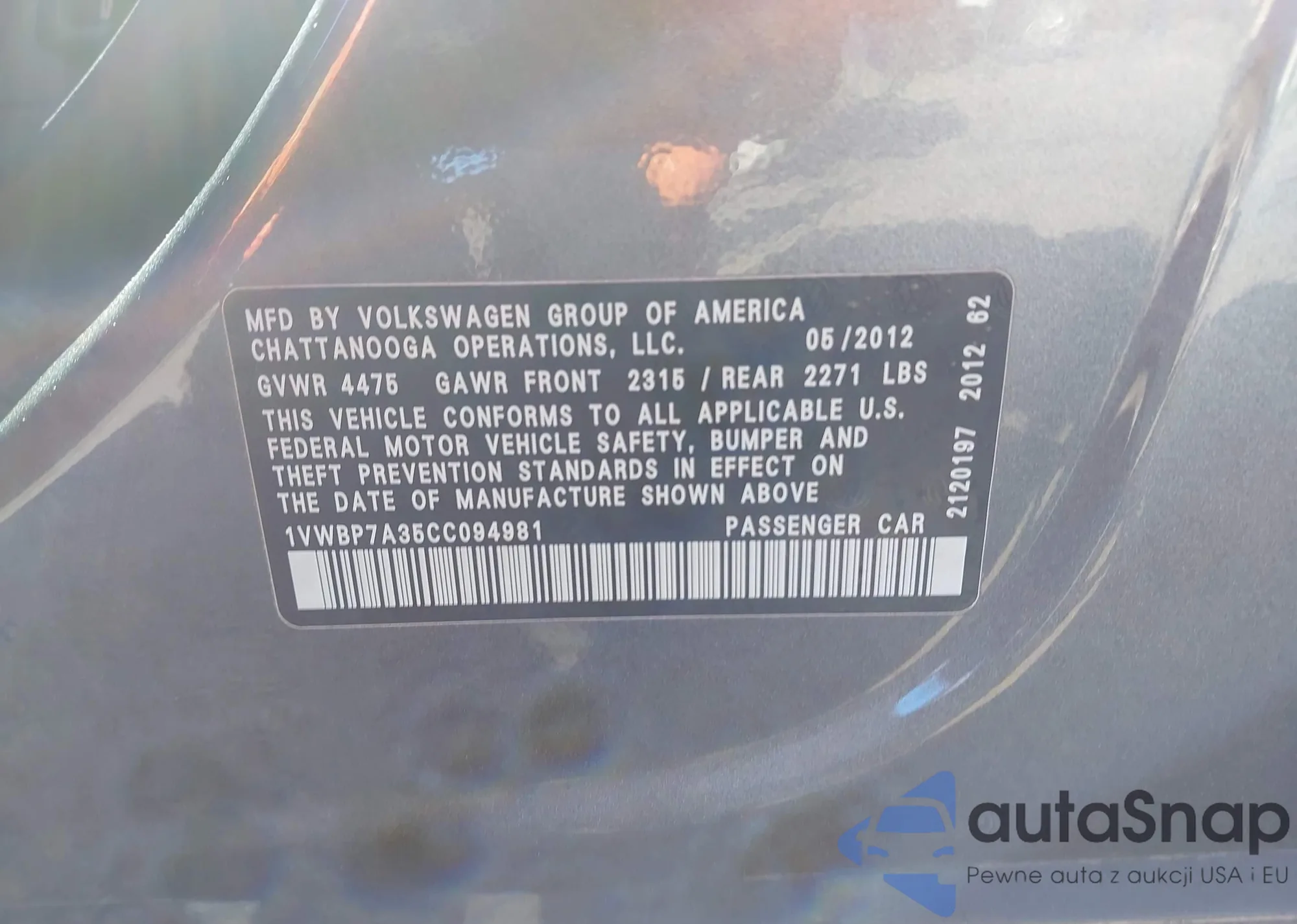 • VIN 1VWBP7A35CC094981