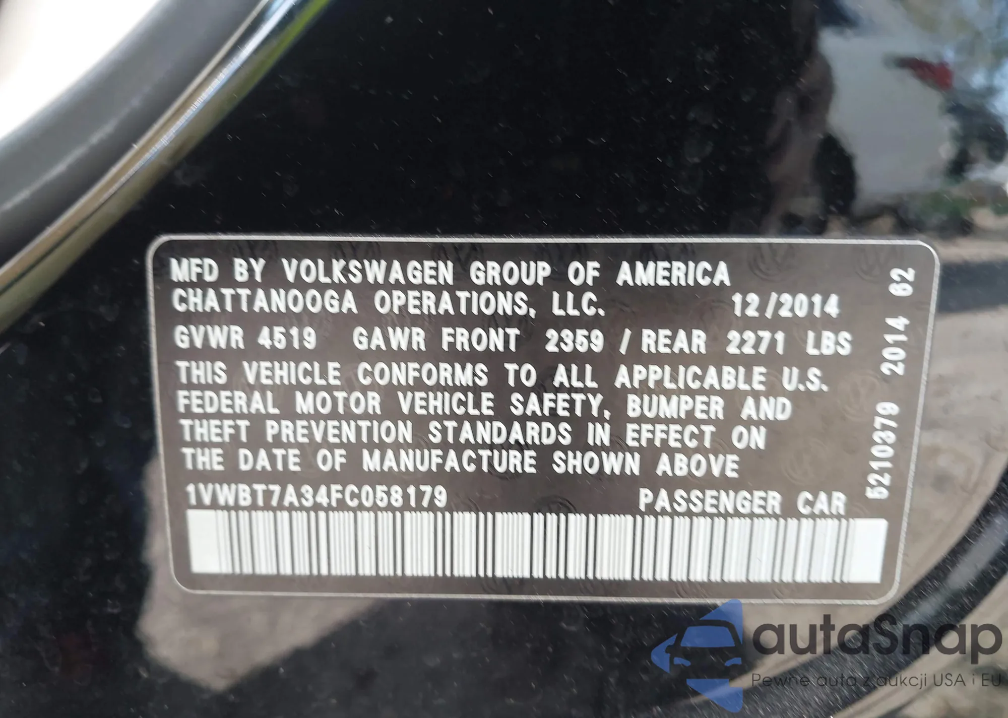 LOT: 44260396 VIN: 1VWBT7A34FC058179