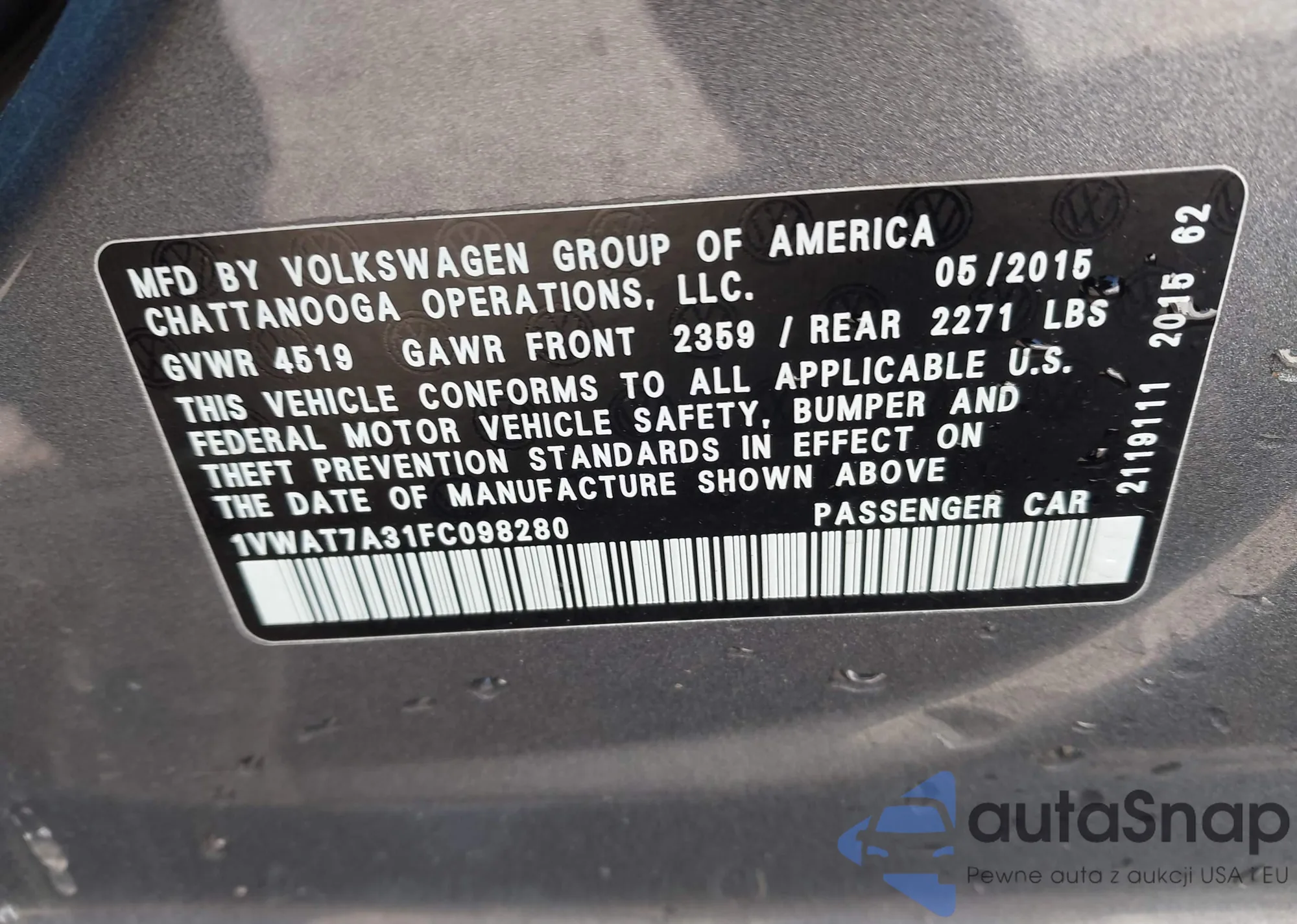 LOT: 44585154 VIN: 1VWAT7A31FC098280