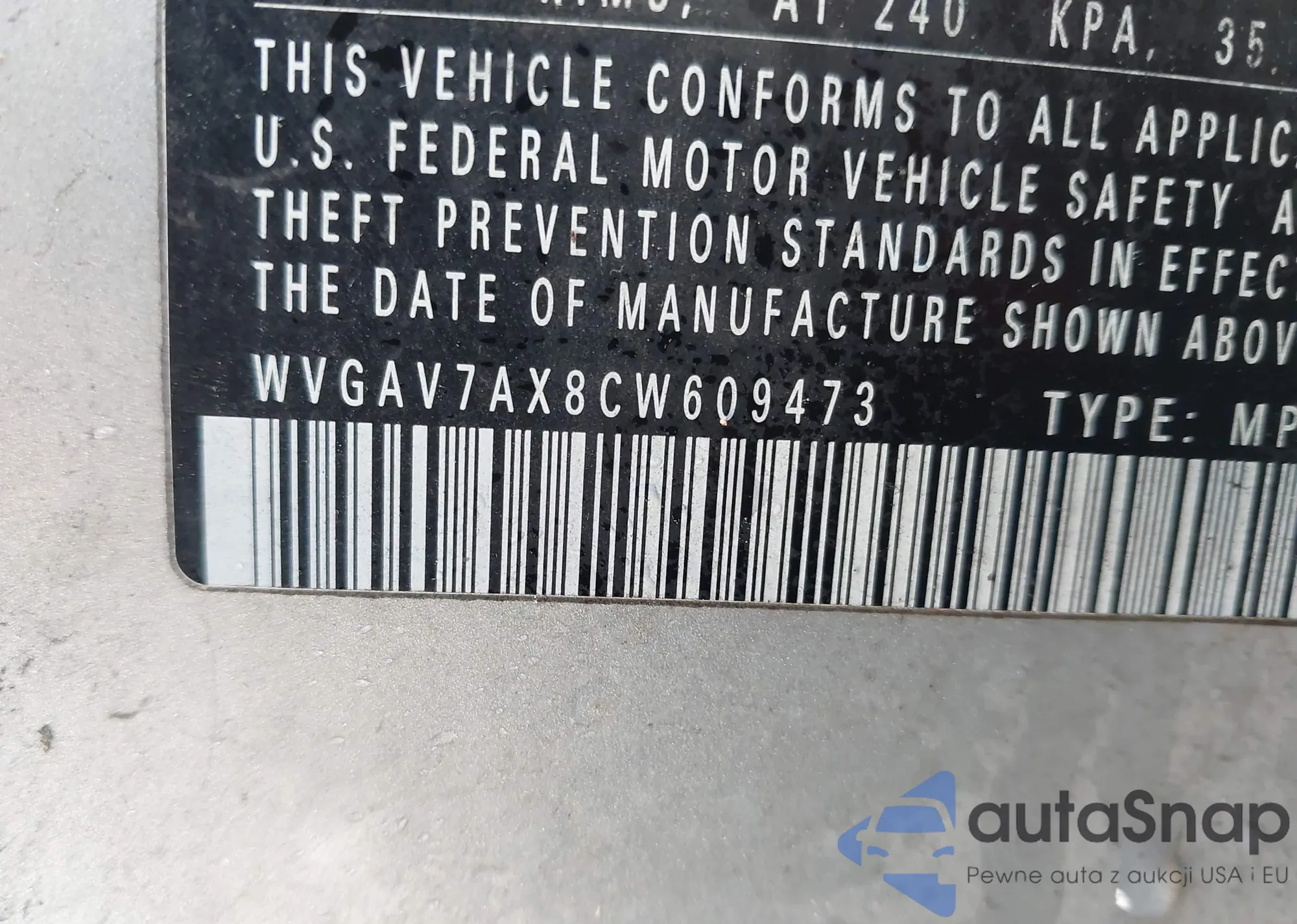 • VIN WVGAV7AX8CW609473