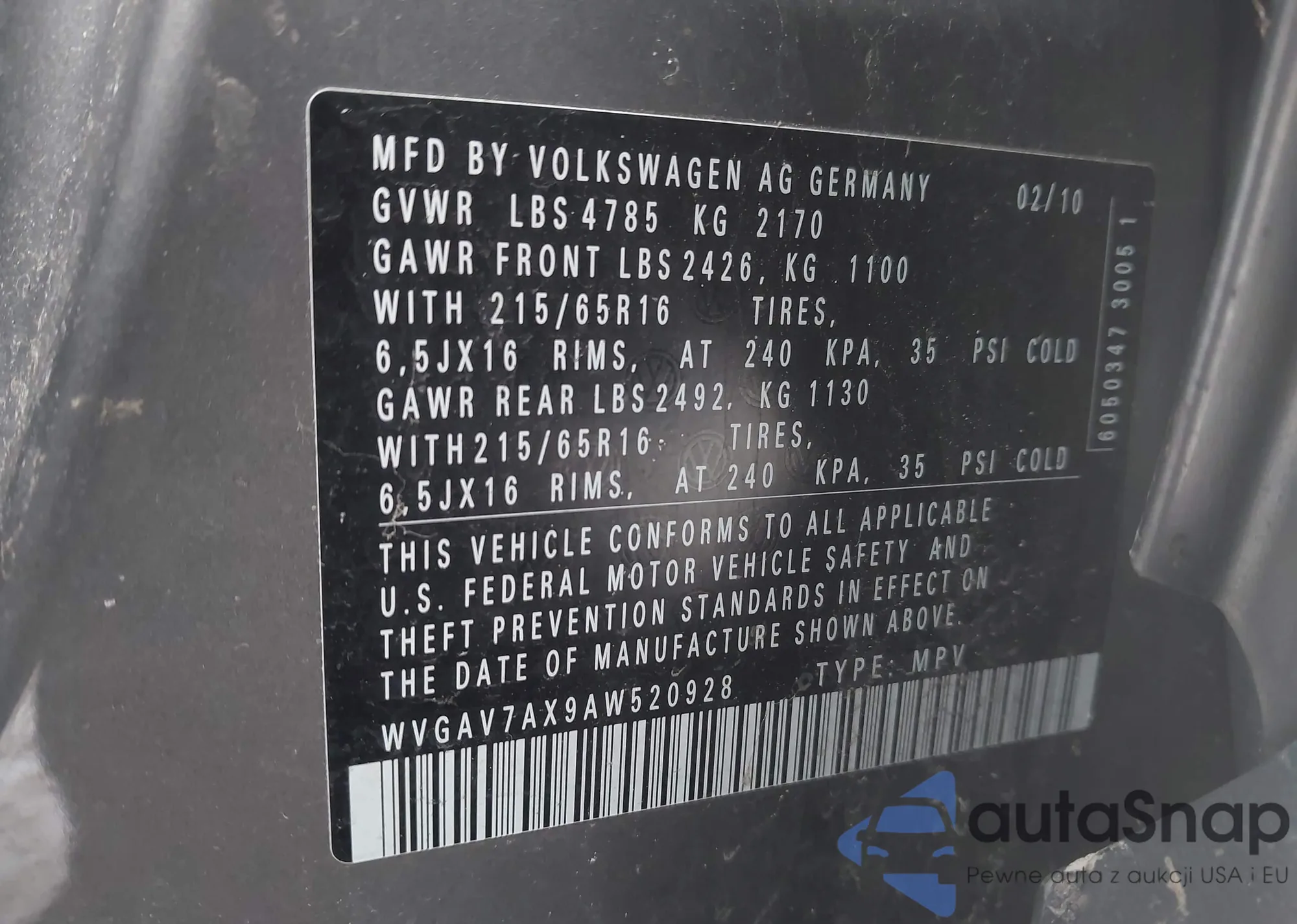 • VIN WVGAV7AX9AW520928