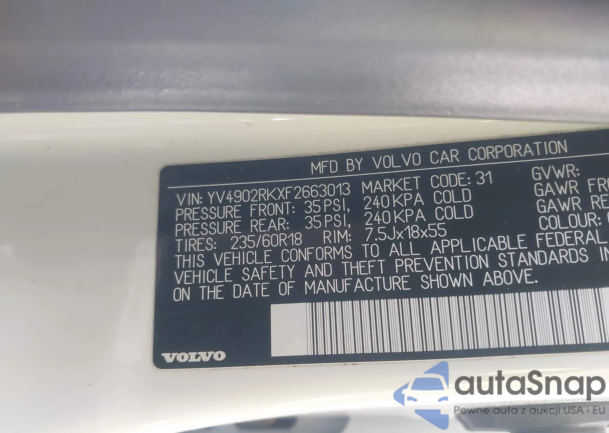 LOT: 44301087 VIN: YV4902RKXF2663013