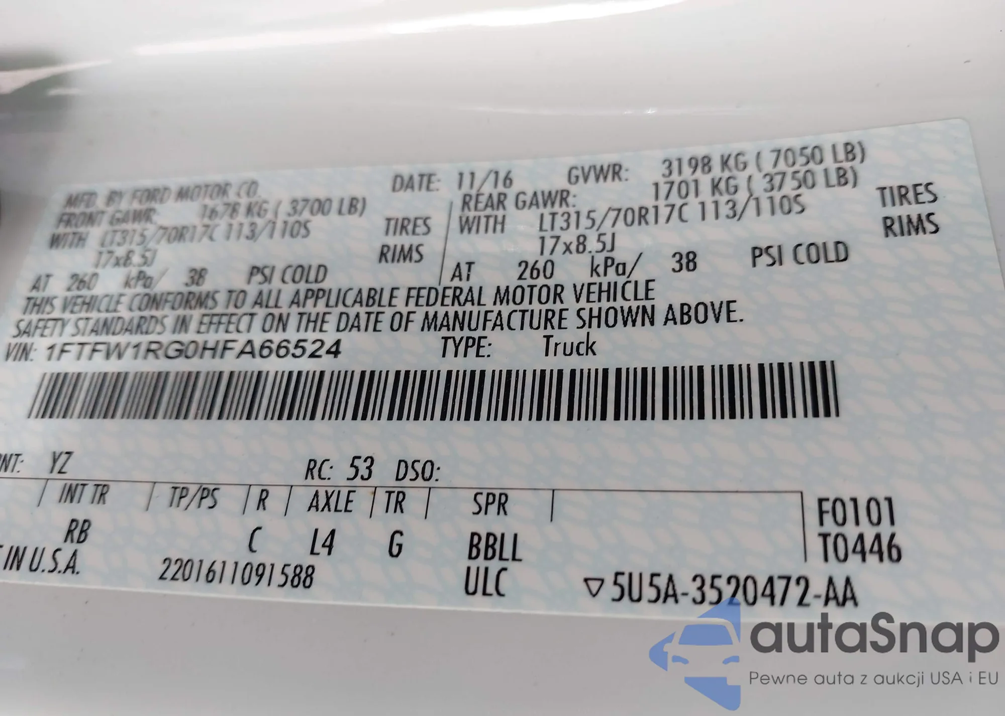 LOT: 40569078 VIN: 1FTFW1RG0HFA66524