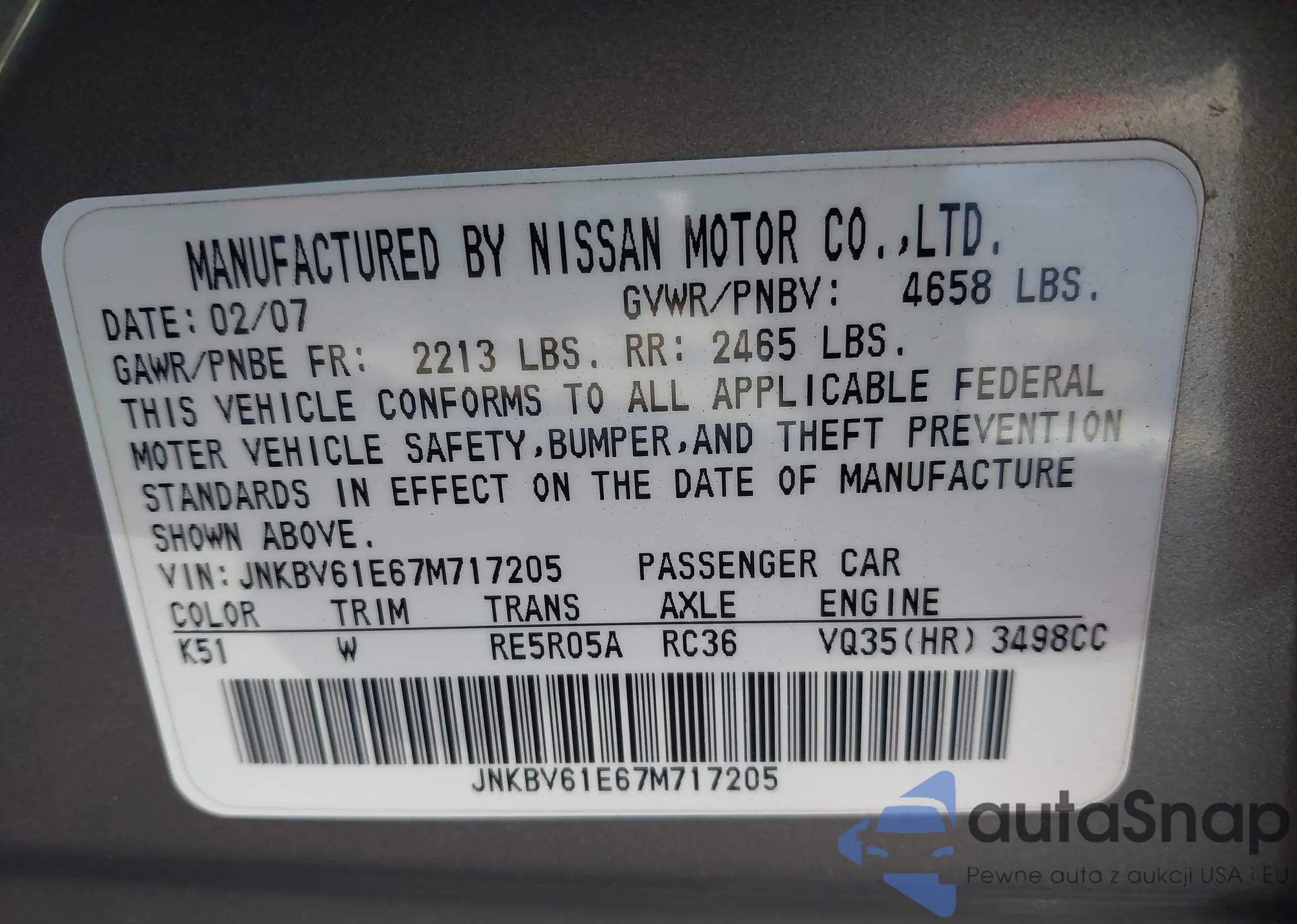 2007 Infiniti G35 Base z USA, uszkodzony, nr VIN JNKBV61E67M717205
