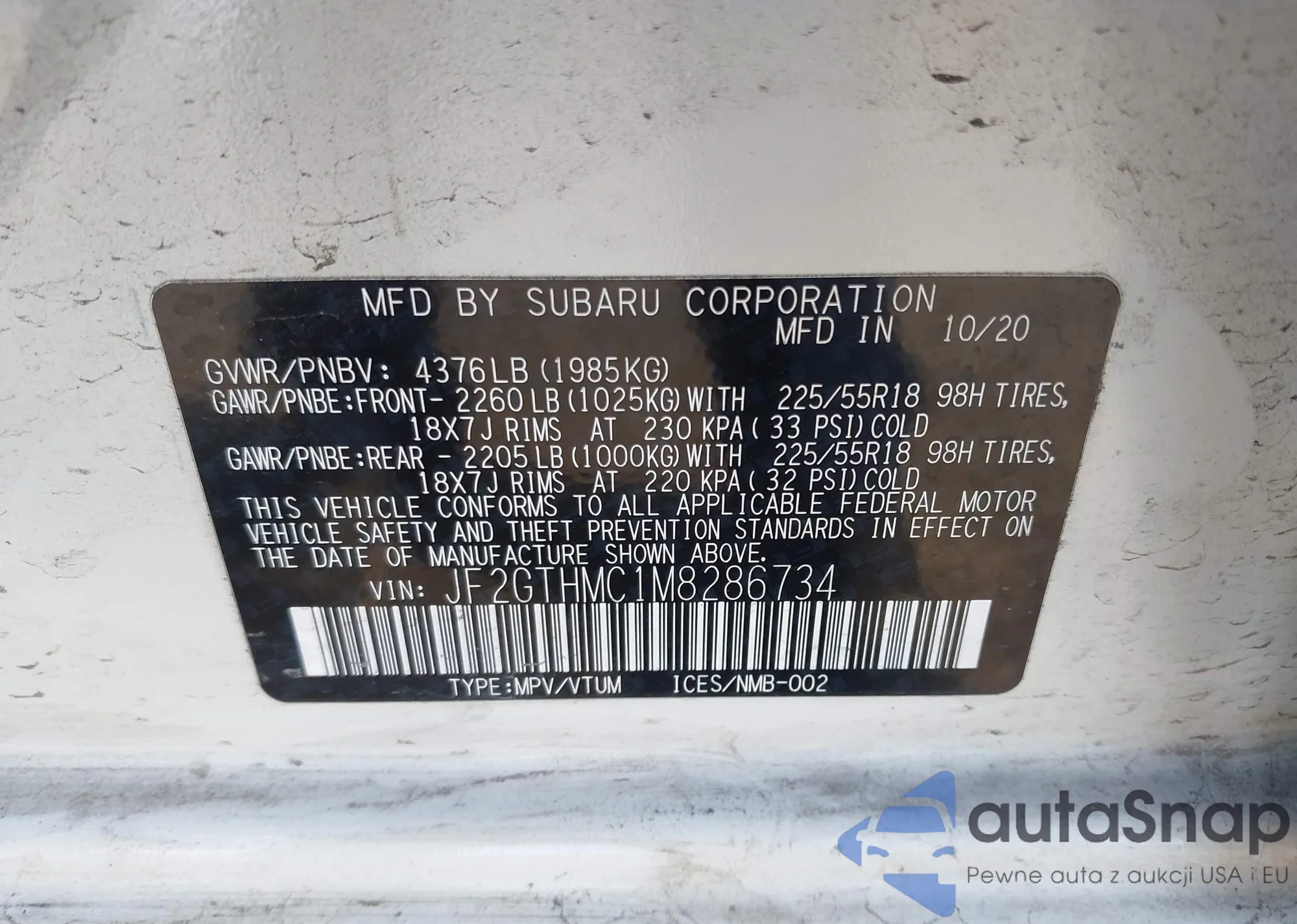 LOT: 41911109 VIN: JF2GTHMC1M8286734