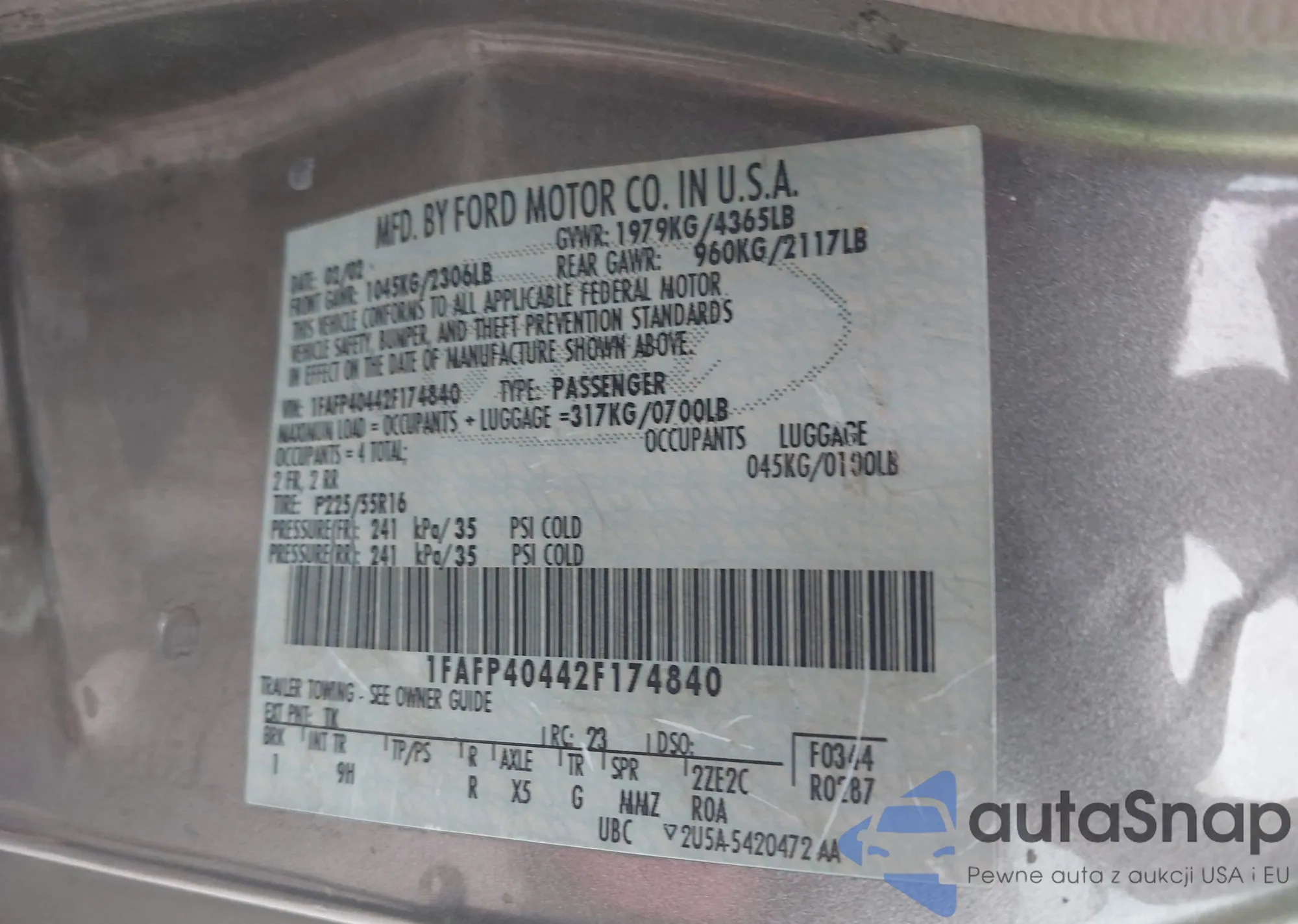 LOT: 41927416 VIN: 1FAFP40442F174840
