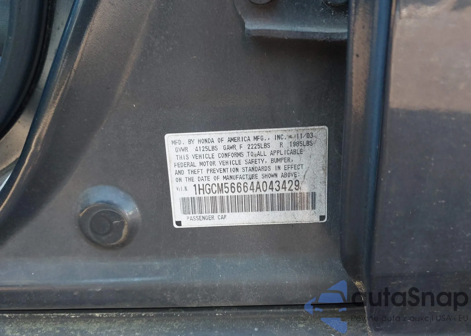 LOT: 41994037 VIN: 1HGCM56664A043429