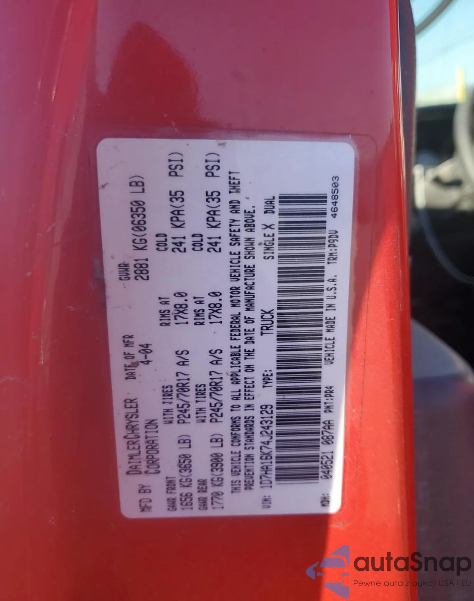 LOT: 53342525 VIN: 1D7HA16K74J243129