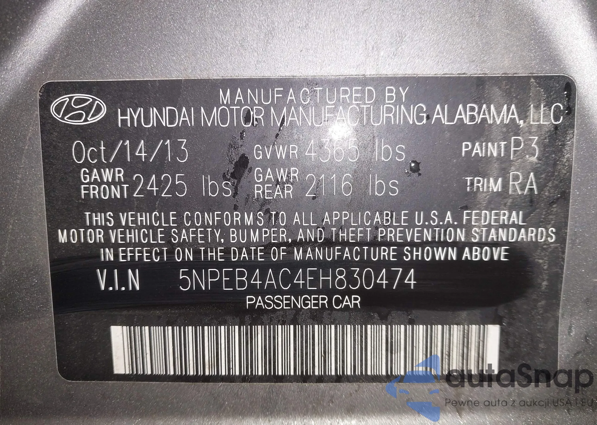 • VIN 5NPEB4AC4EH830474