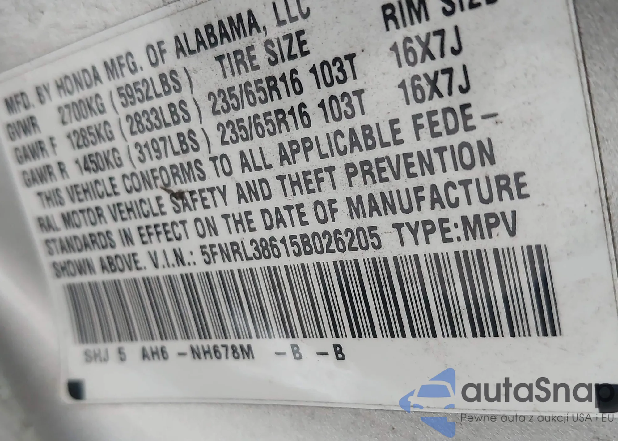 • VIN 5FNRL38615B026205