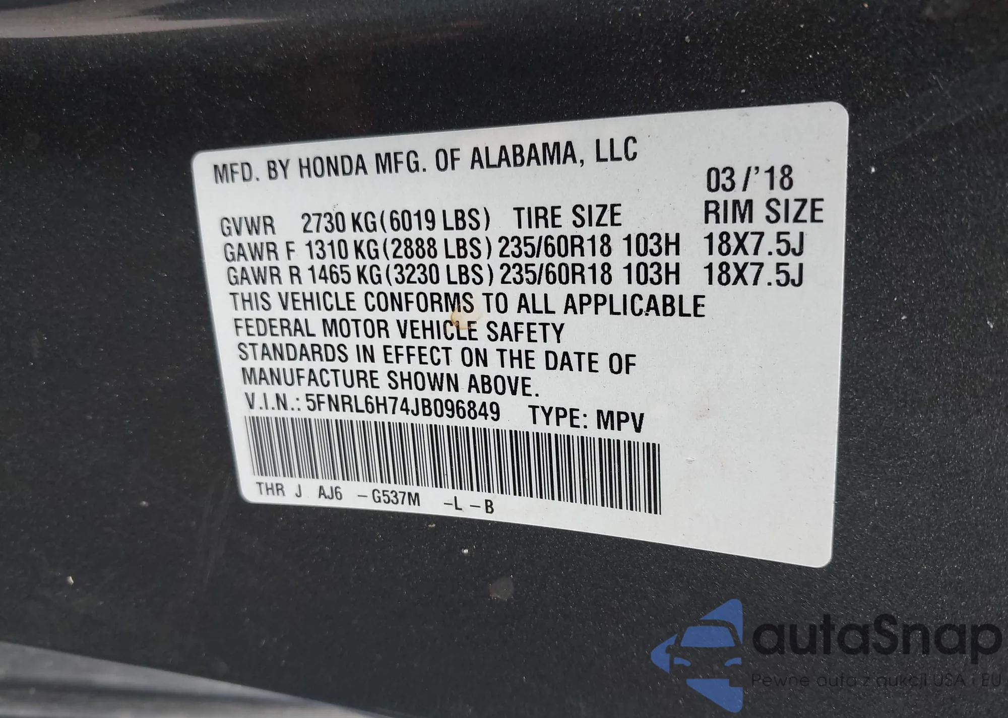 • VIN 5FNRL6H74JB096849