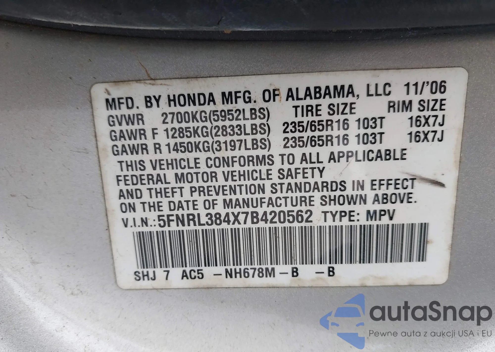 • VIN 5FNRL384X7B420562