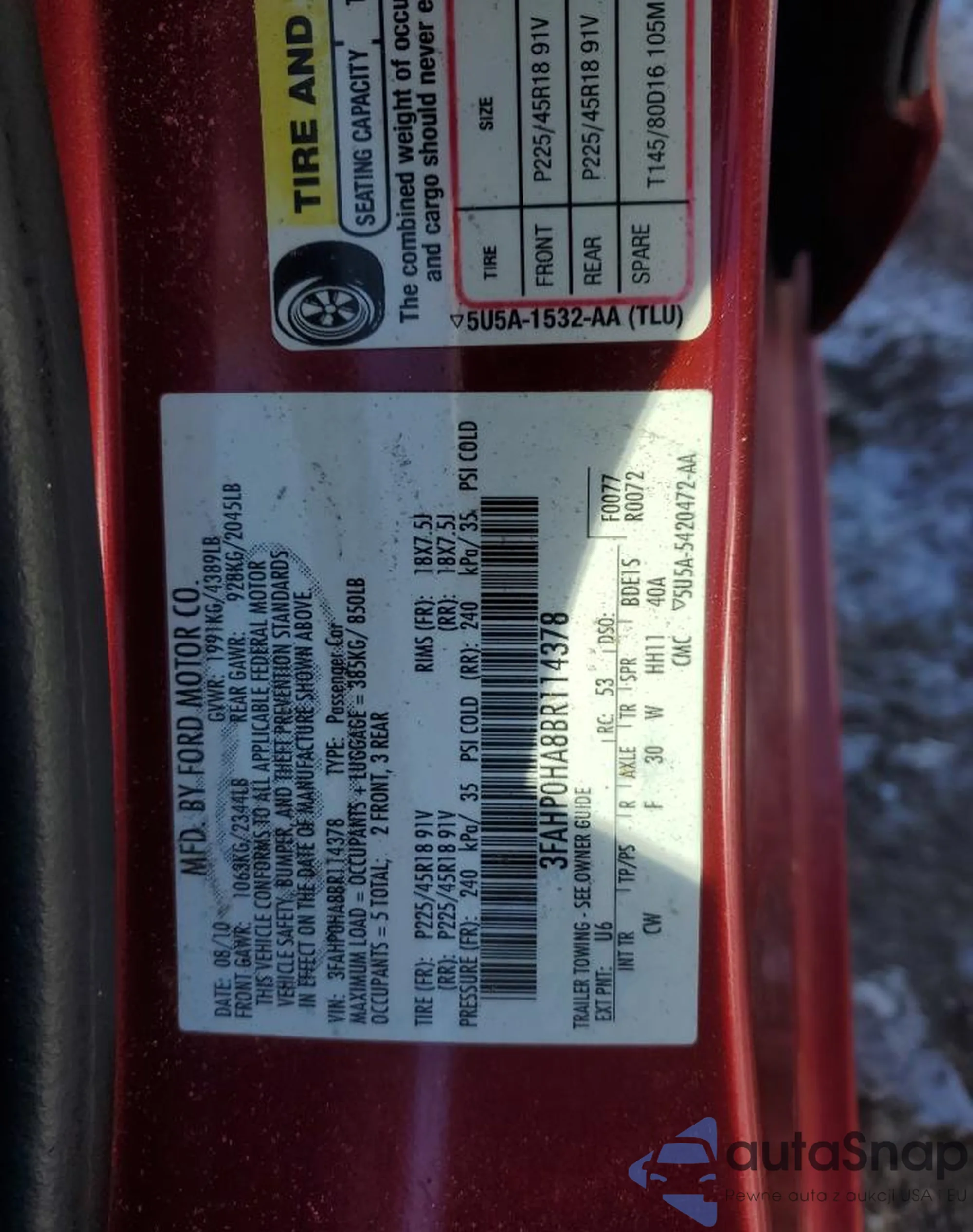 • VIN 3FAHP0HA8BR114378