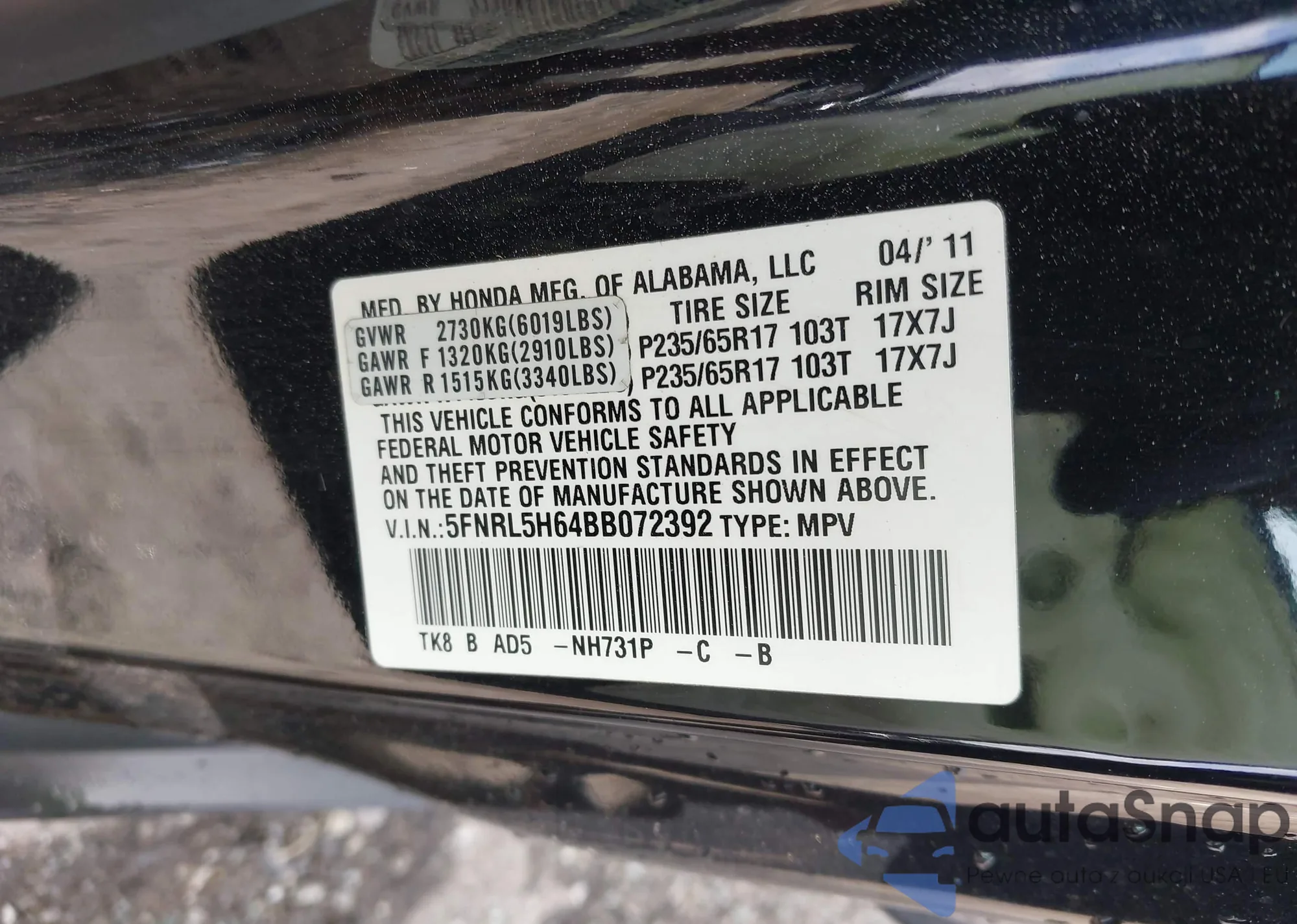 • VIN 5FNRL5H64BB072392