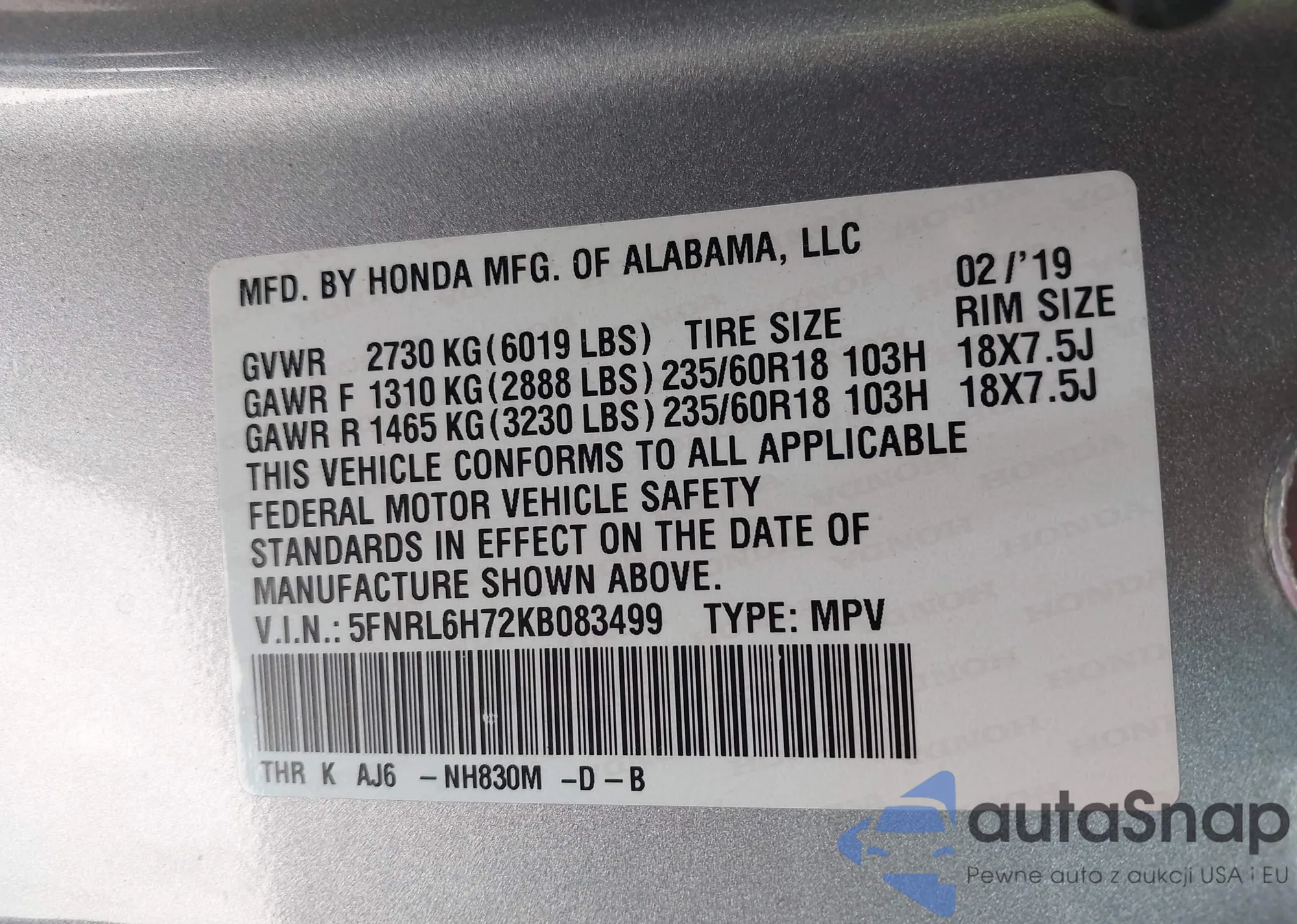 • VIN 5FNRL6H72KB083499
